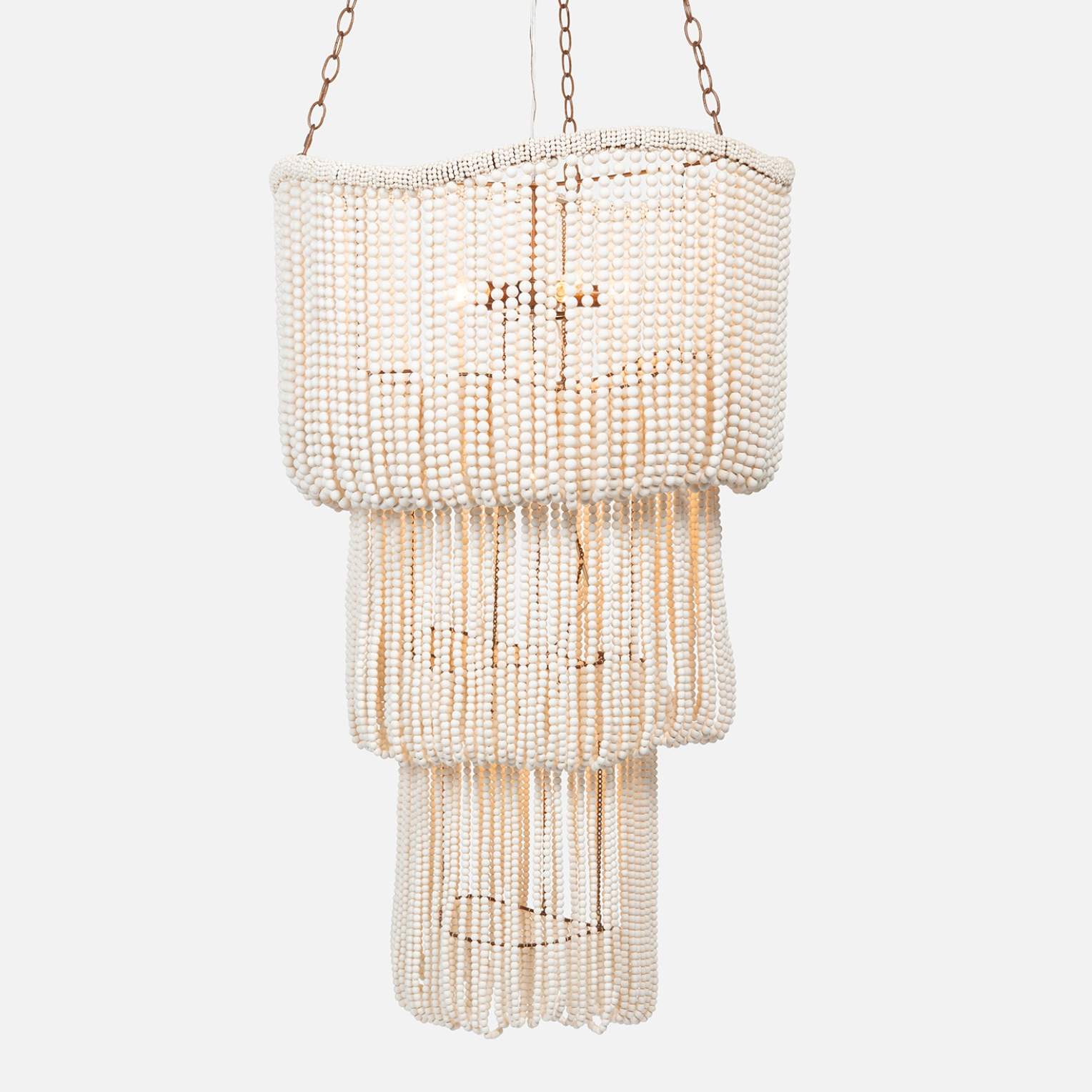 Two- or three-tiered chandelier draped with hand-strung coco beads, perfect for creating a dramatic effect.