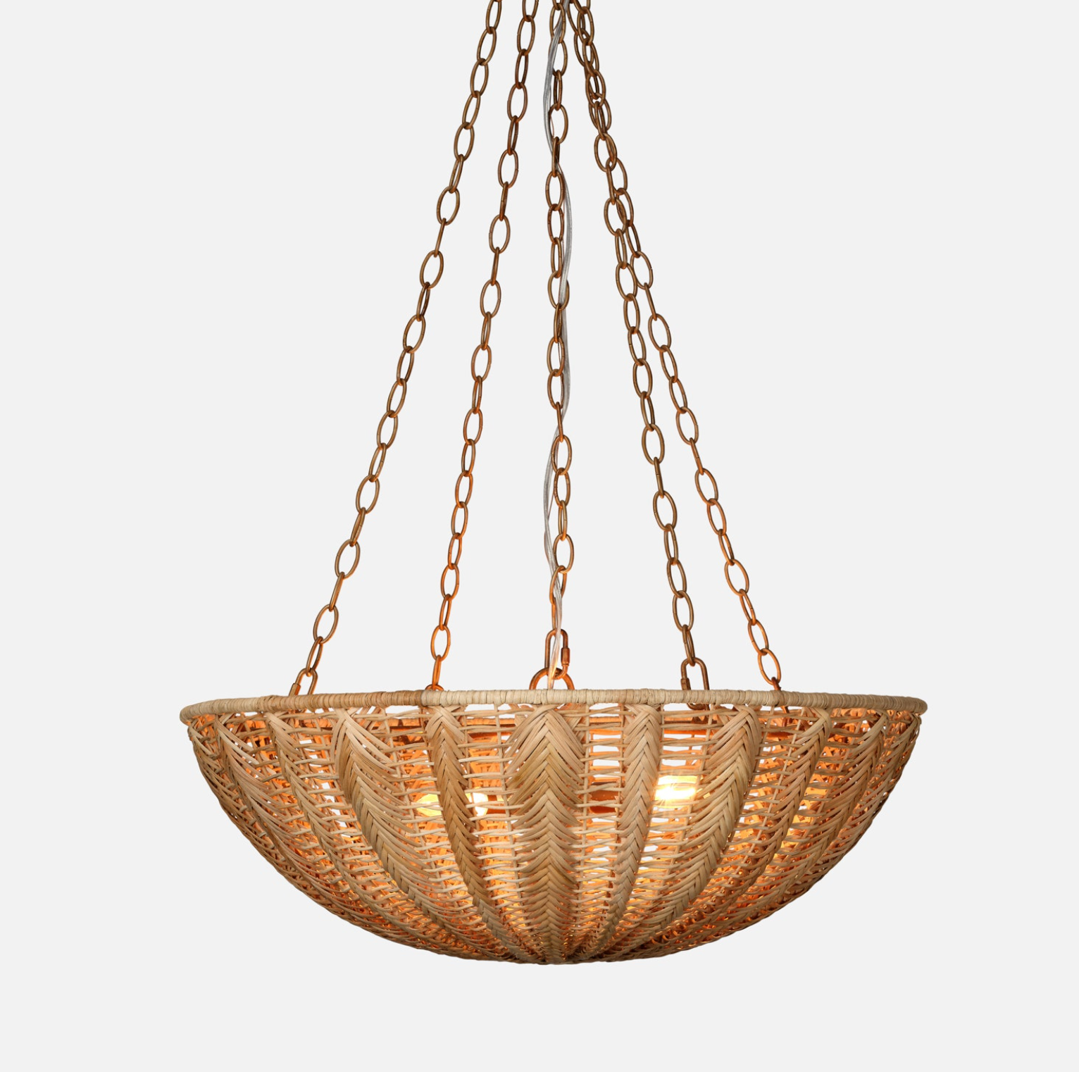 The Magdalena is bowl-shaped and intricately woven into varying patterns from strong, supple rattan. A sleek chain completes the look.