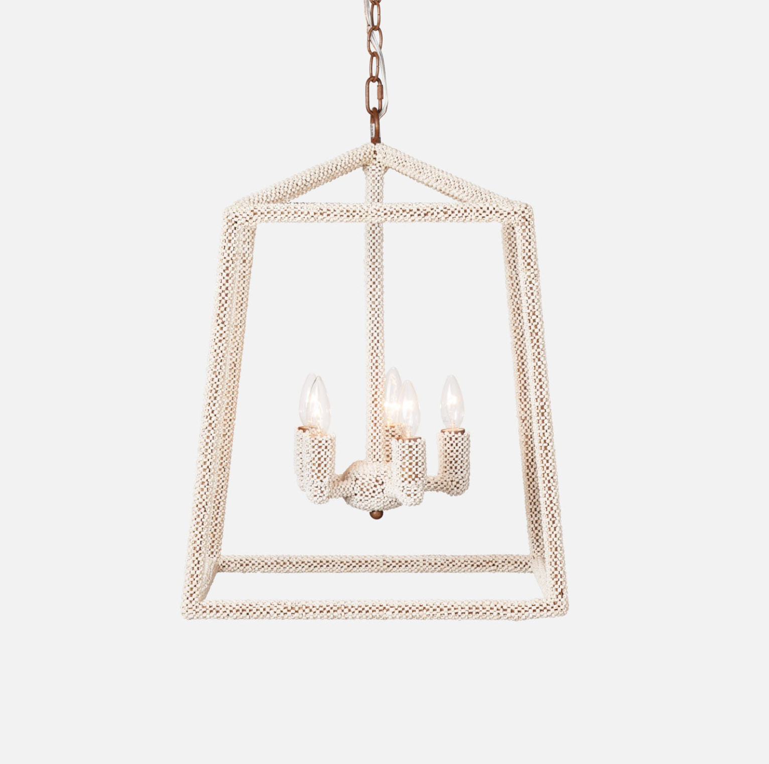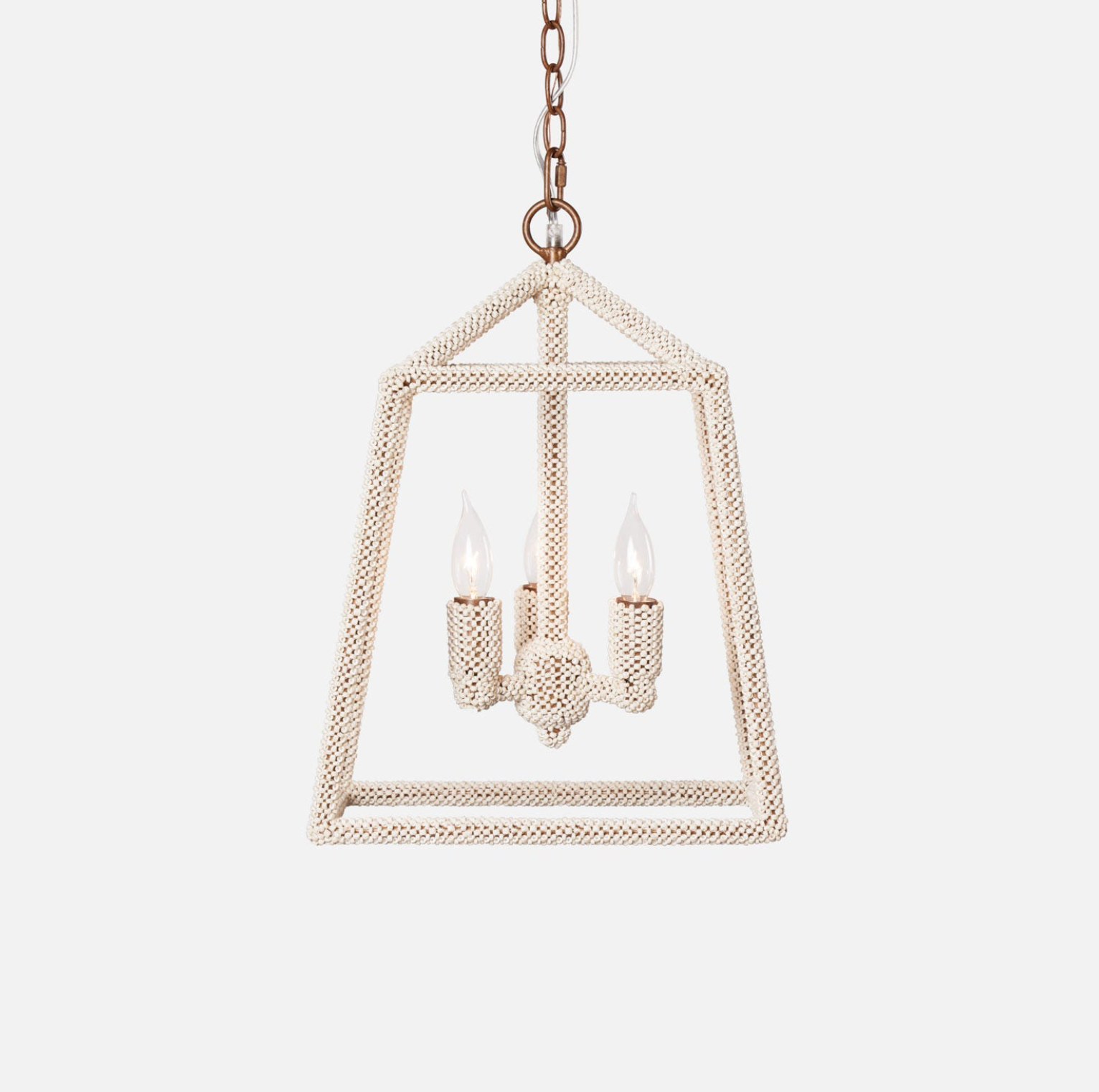 The Maritsa chandelier collection consists of an open-frame of heavy tarnished gold metal covered in coco beads.