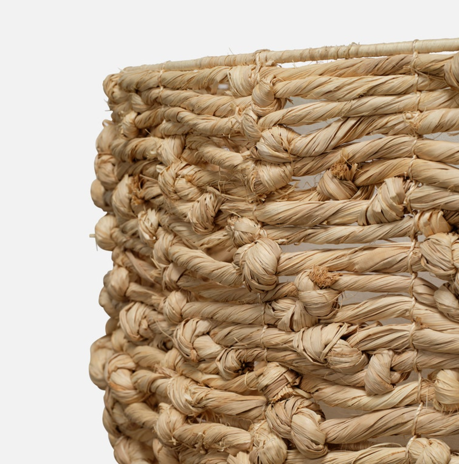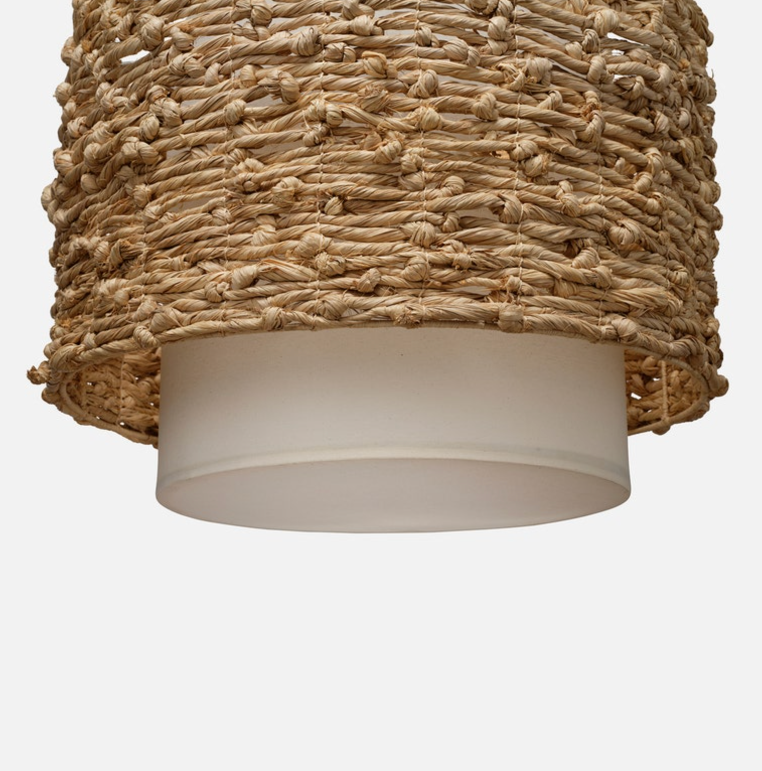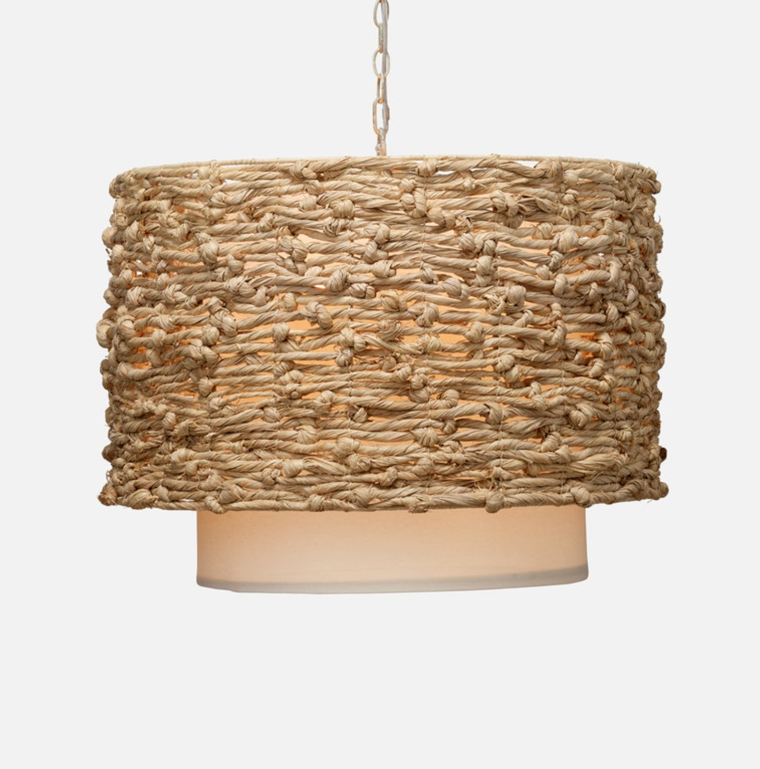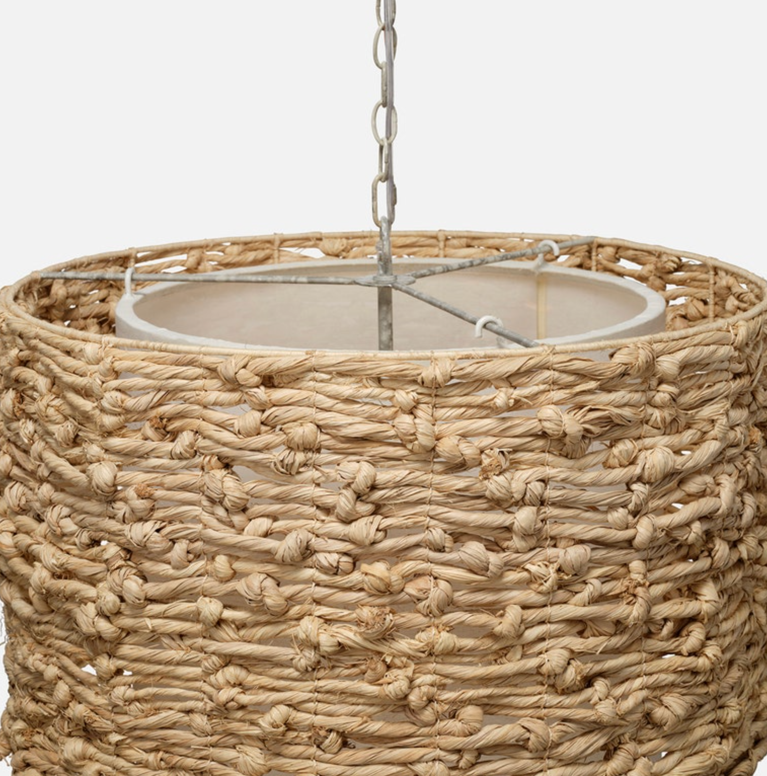 Thick strands of seagrass are loosely woven into the drum shape of the Nina chandelier. Exposed knotting details make the piece exceptional. Finished with an optional linen drop shade.