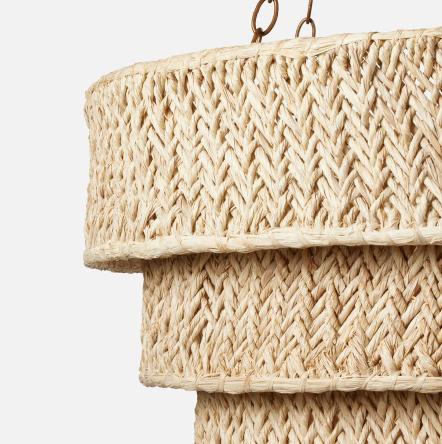 Traditional elegance meets relaxed style in our Sibyl, a three-tiered chandelier with natural raffia shades, woven in a modern, textured chevron pattern. Five metal chains in an antique brass finish refine the look.