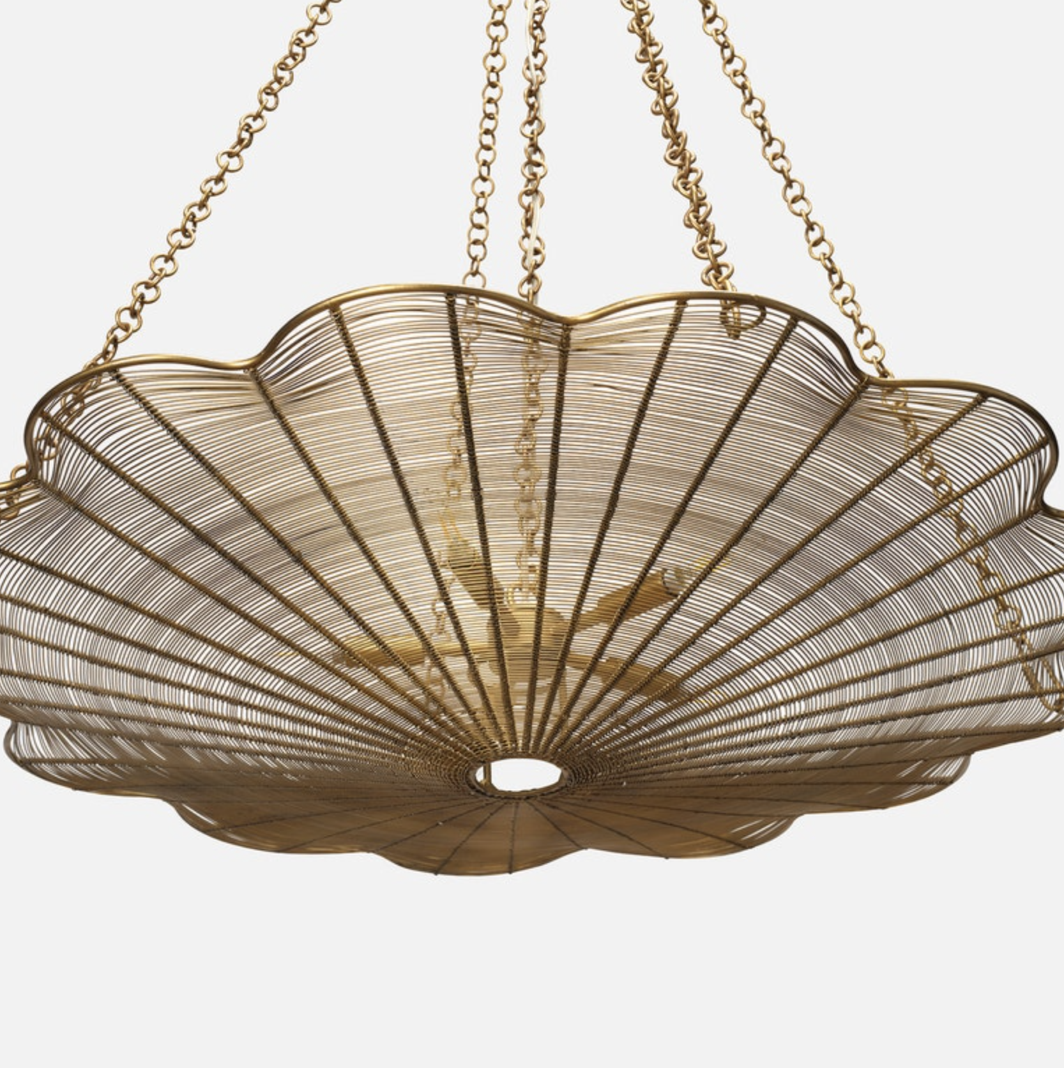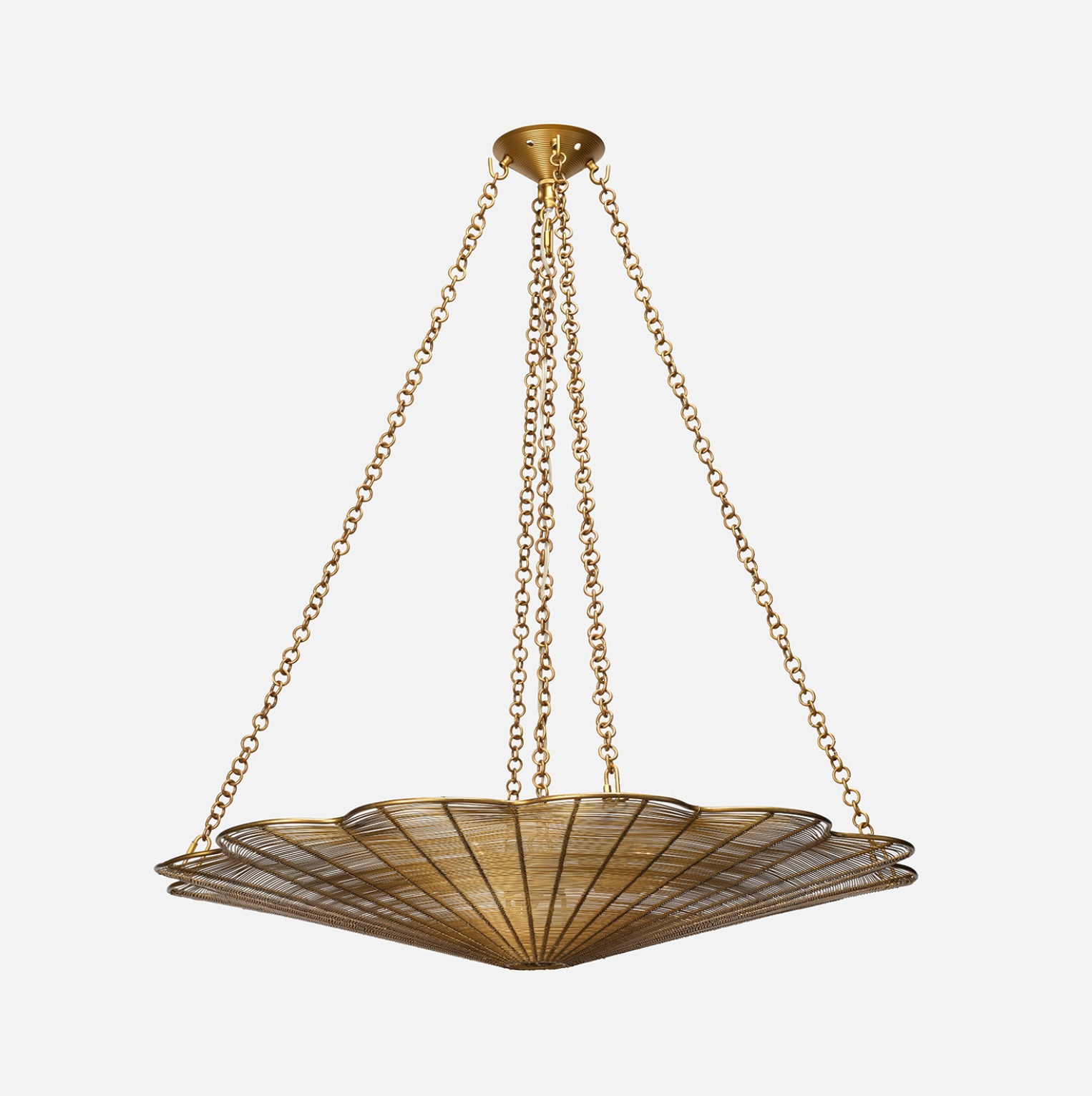 The Venia Chandelier features iron accents with radiating lines extending from a central ring. Curved edges illuminate, while iron chains support this striking chandelier.