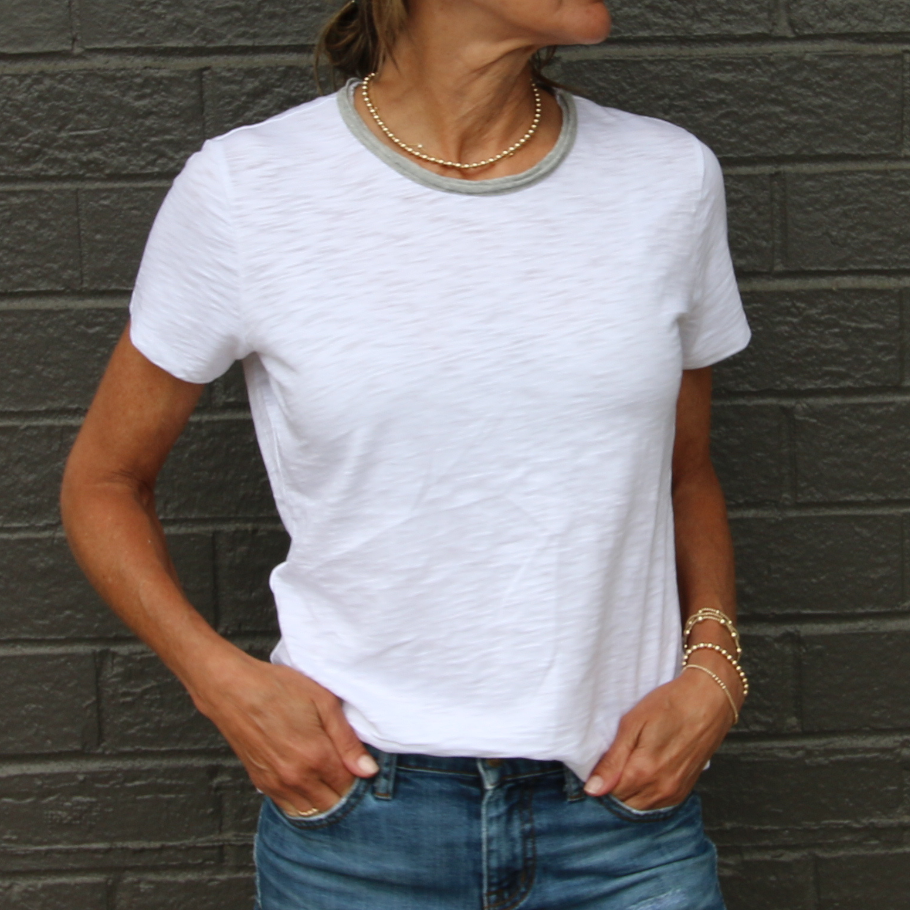 Our signature Rebel Tee with a skinny raw-edge neckline in new contrast colors. So Fun! This stylish, short sleeve (another perfect white) erin gray tee is great for adding a little pop of color to a classic style.