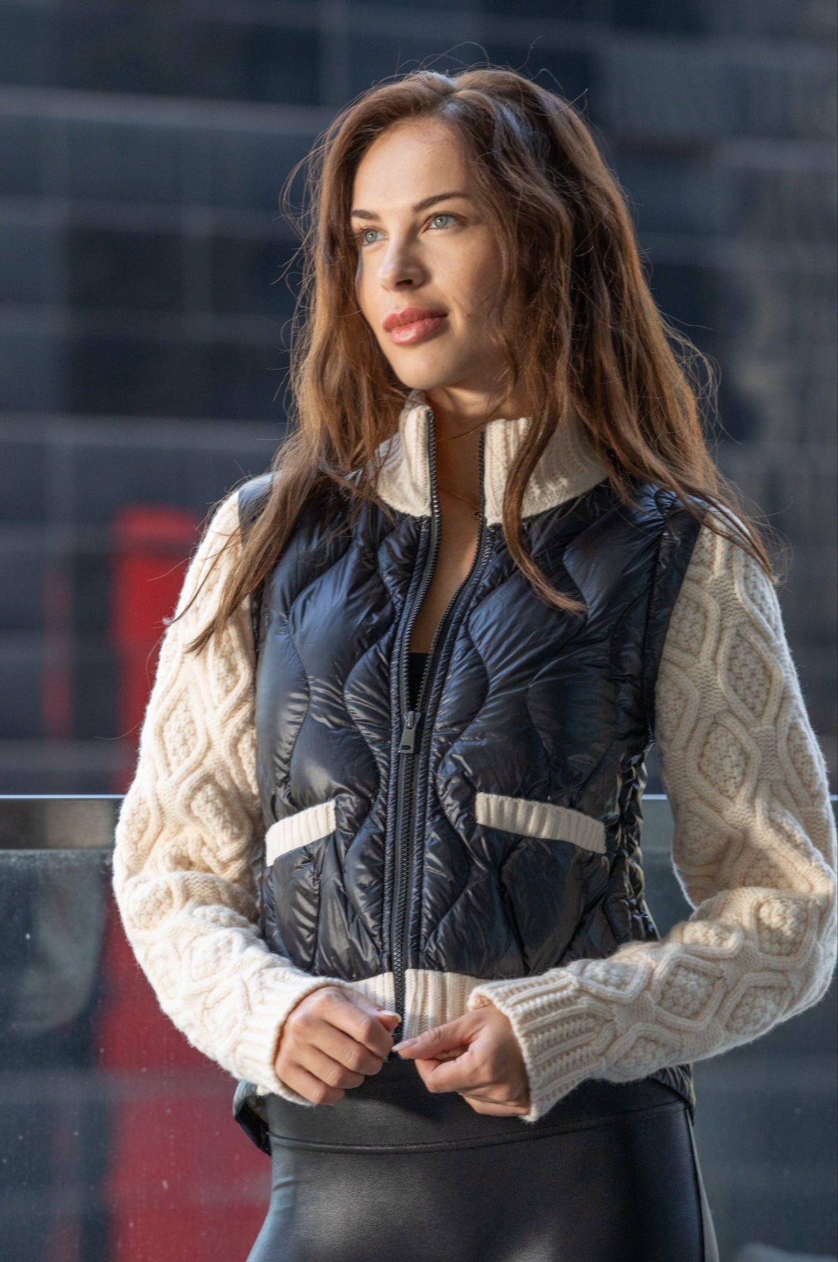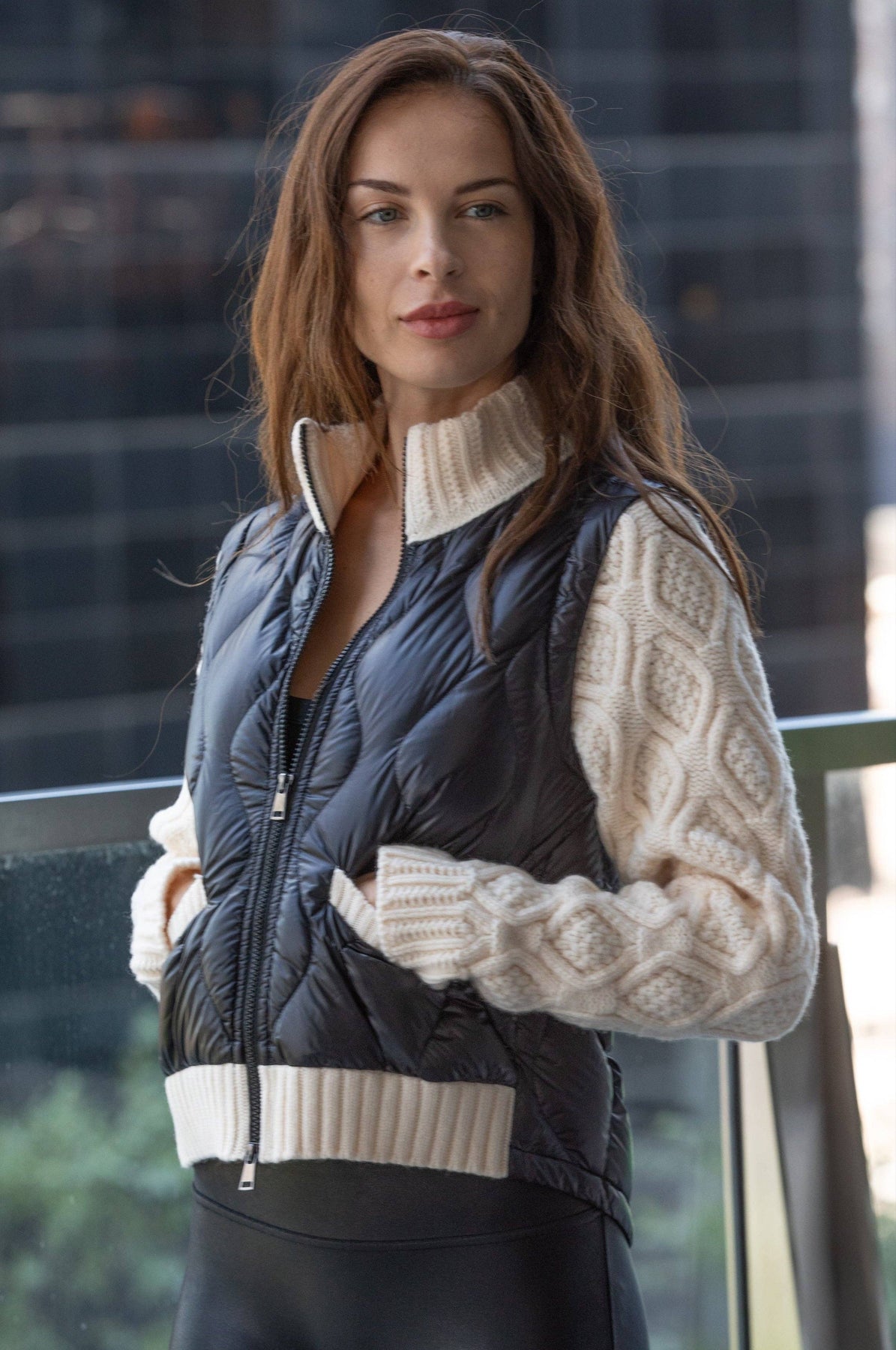 Super soft and light quilted down combined with thick soft woolen sleeves.