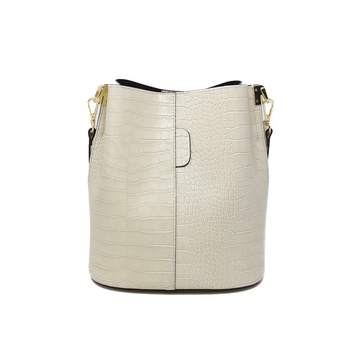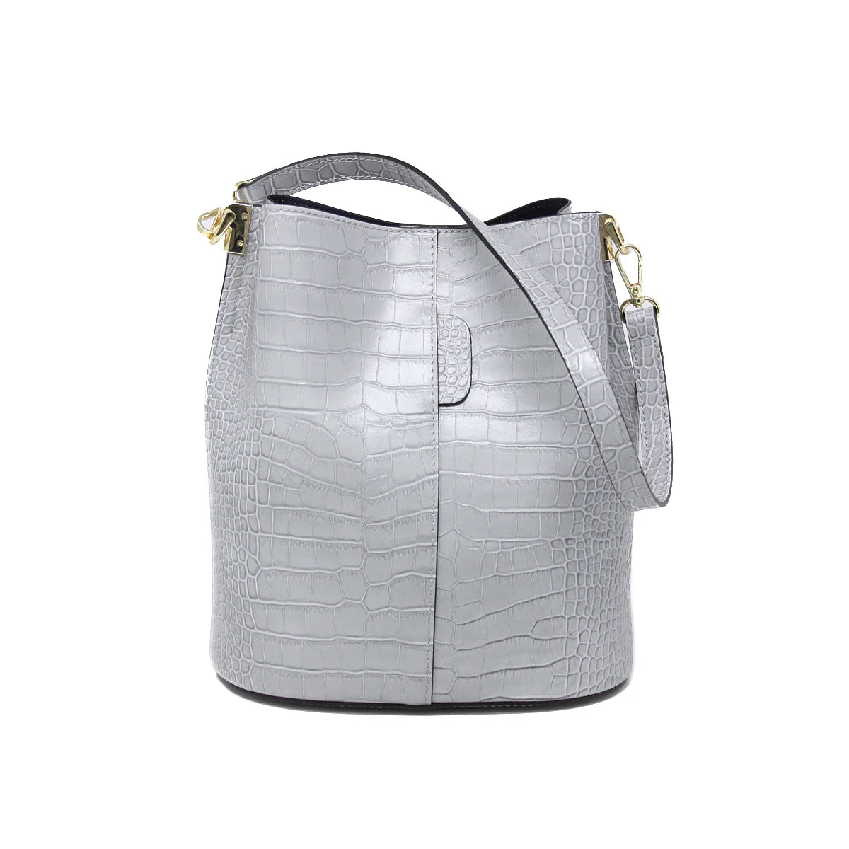 This bucket bag is crafted from genuine Italian Leather it features a croc embossed along with a convenient top handle and a removable shoulder strap. It has a hidden snap closure and gold hardware with an internal zipper, making it the perfect blend of style and functionality for daily needs.