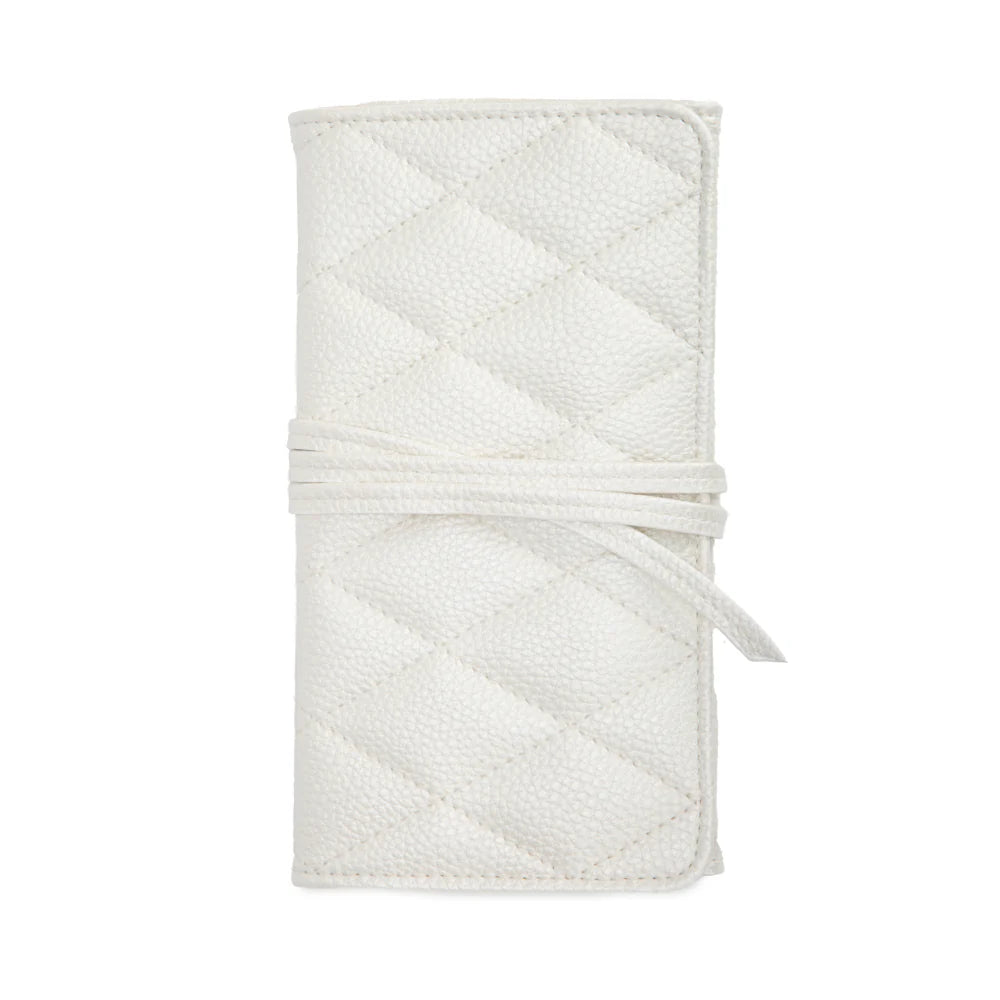 Quilted Jewelry Roll - crafted with premium quilted vegan leather, this jewelry roll exudes elegance and sophistication, making it the perfect accessory for any fashion-forward individual. Lined with soft velour, the interior has 2 spacious zipper pockets, providing ample space for all your bracelets and necklaces. But that's not all, it features a ring roll that can hold up to 8 rings and a dedicated earring tab that can accommodate 4 sets of earrings, you can bring all your favorite pairs wherever you go!