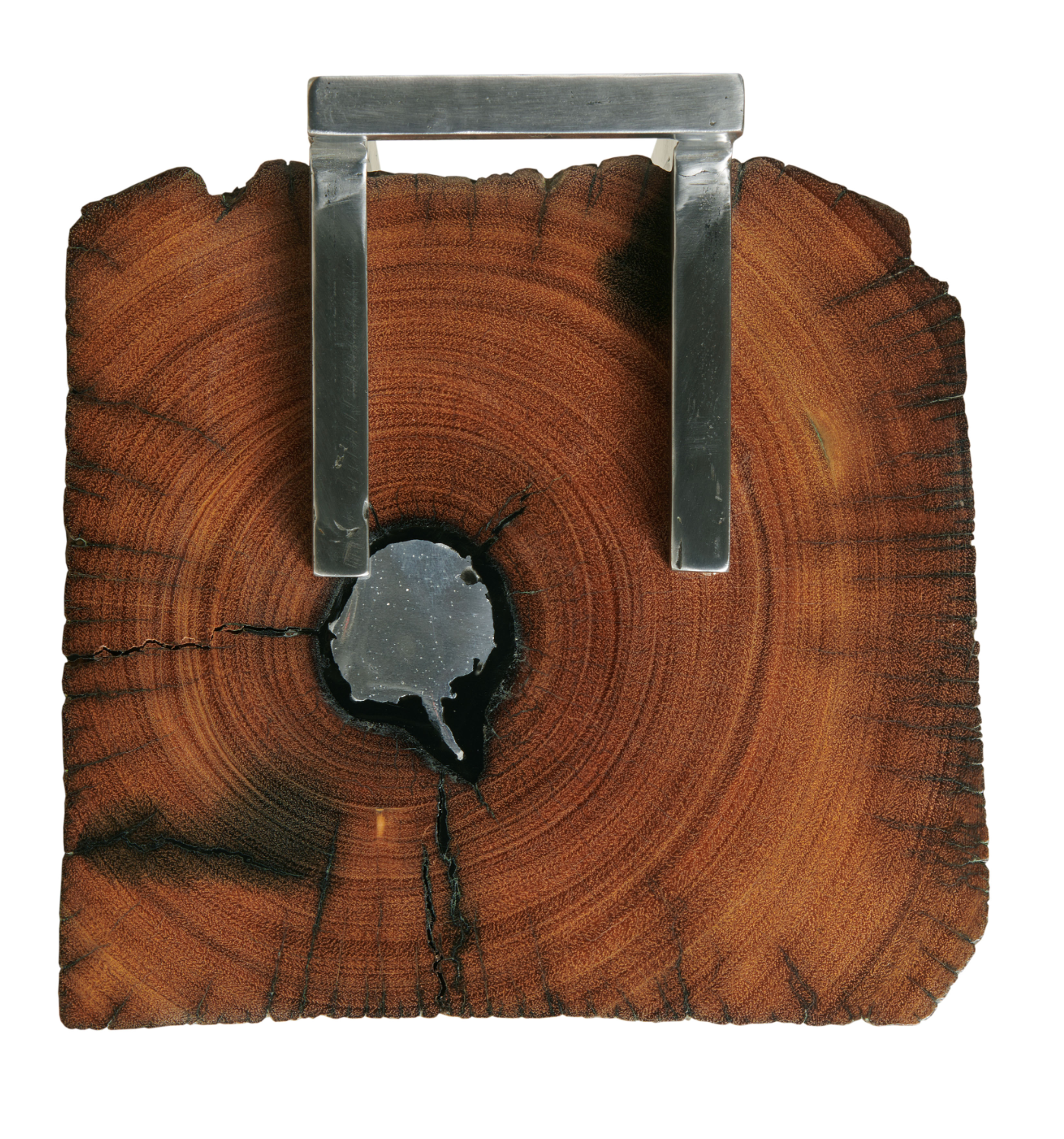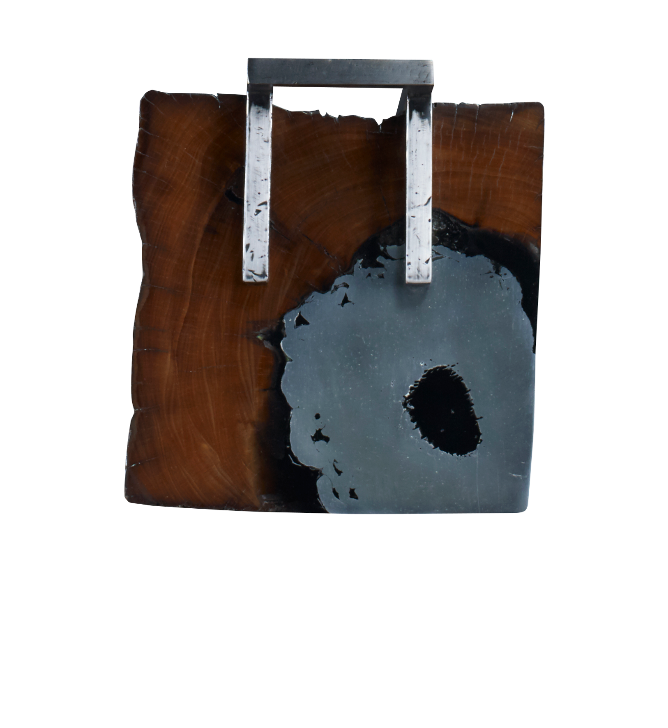 Material: Reclaimed oak with cast aluminum accent top with textured finish steel frame