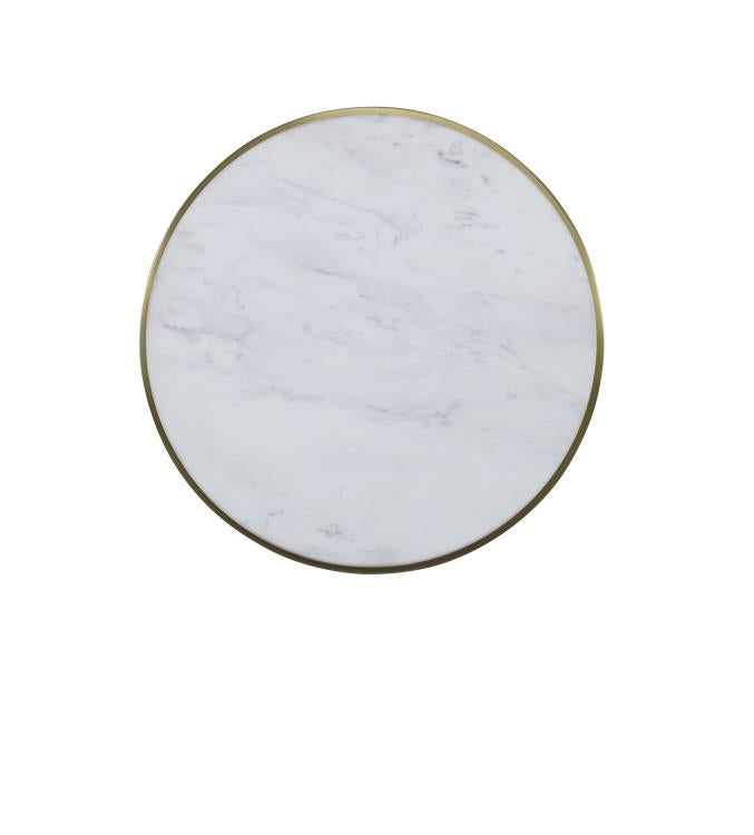 This small accent table features a wide square block base crafted in oak solids and narrow heart oak veneer that tapers upwards with clipped corners to an octagonal shape where a post of antique brass supports an antique brass top with inset Carrara marble. Finished in a low sheen, warm, neutral, Sand Cerused finish that amplifies the natural grain of the oak.