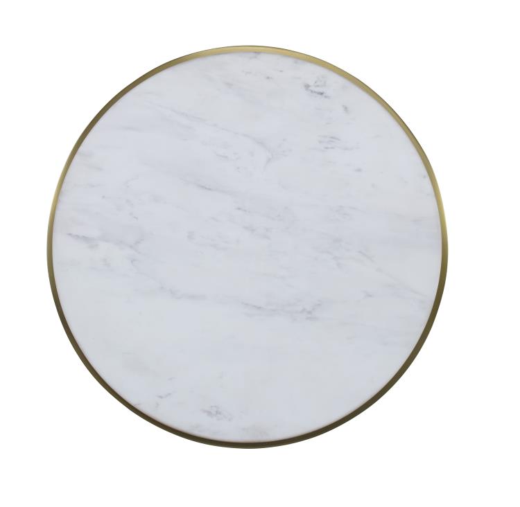 This small accent table features a wide square block base crafted in oak solids and narrow heart oak veneer that tapers upwards with clipped corners to an octagonal shape where a post of antique brass supports an antique brass top with inset Carrara marble. Finished in a low sheen, rich, warm brown Mocha finish.
