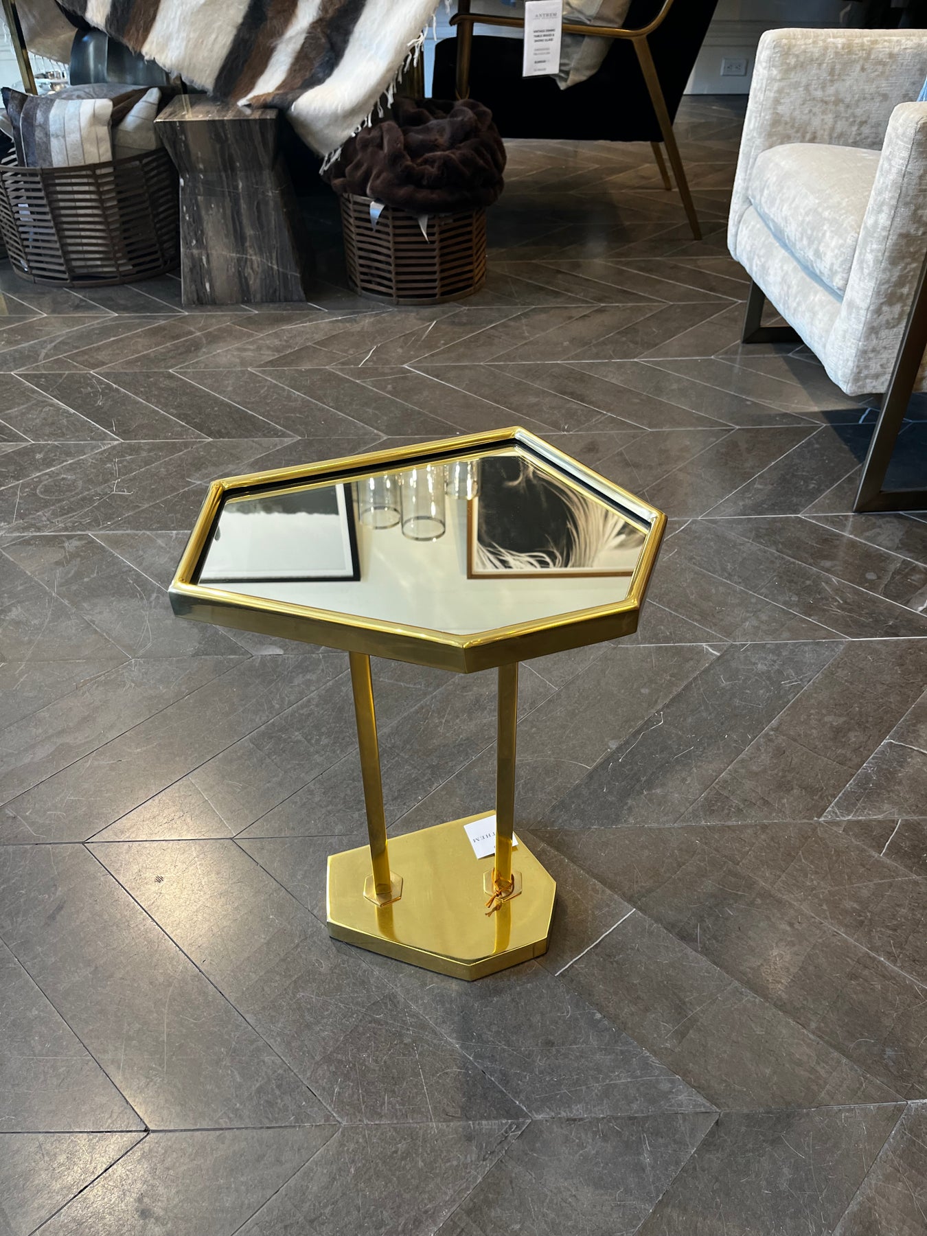 The Brass Side Table is a polished brass drinks table featuring a double stemmed base and asymmetrical, hexagonal top and base with a clear mirror insert. A perfect little accent for any room in the house, it has just enough surface for a pair of drinks.