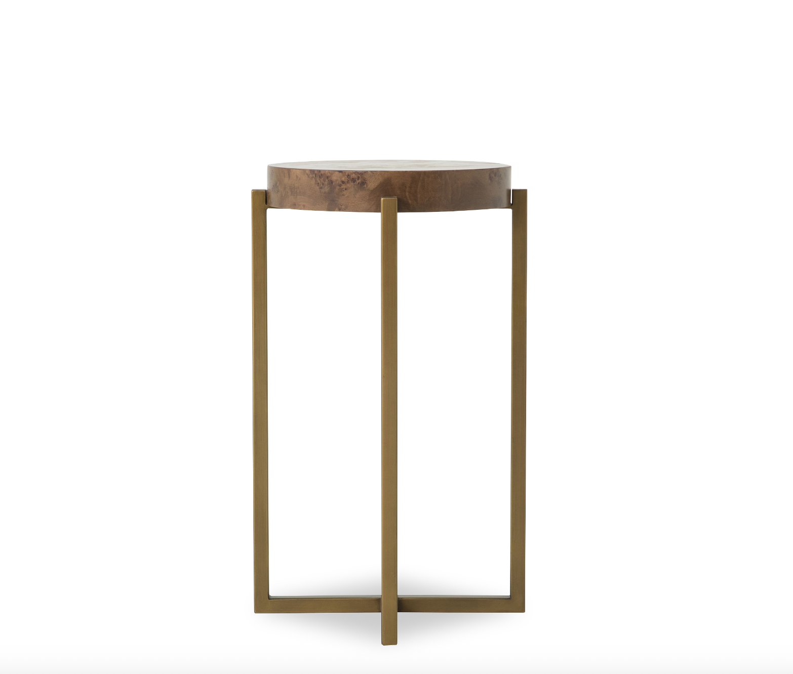 The Lauren Accent Table from the Monarch collection features a stunning Mappa Burl top with a medium-to-dark stain, paired with an antique brass finish metal base. Its elegant design and refined materials make it a perfect accent piece for adding sophistication to any room.