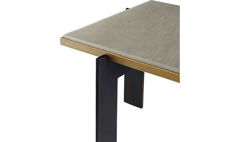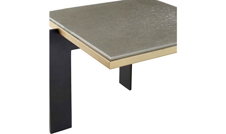 Sometimes the simplest of designs are the most intriguing. The carefully crafted brass frames a floating panel of artisan glass. The thoughtful, placement of the metal legs offers visual balance and interest at the perfect scale to sit beside a sofa.