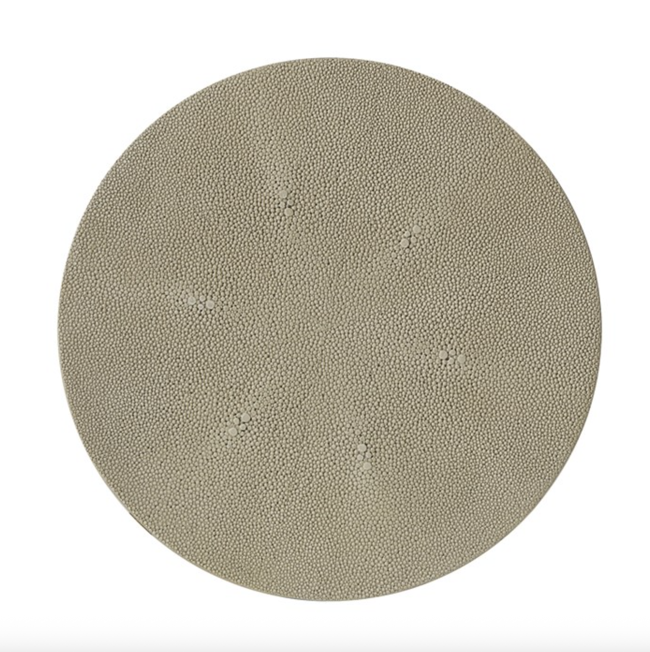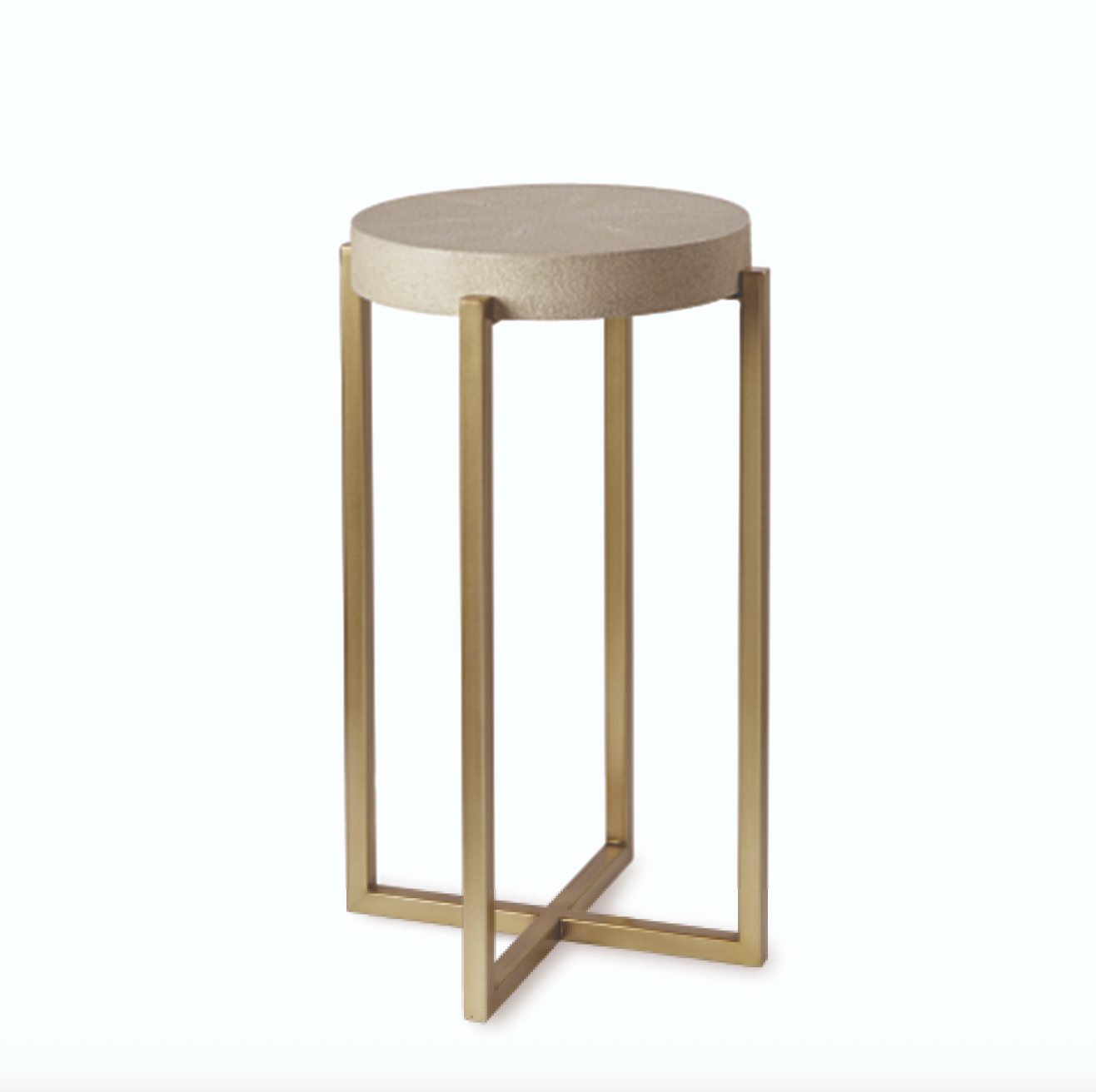 Our Kendall series reflects today’s casual contemporary lifestyle. This drinks table is the perfect companion to a pair of chairs. A round faux shagreen top finished in a soft cream rests on four tubular legs crafted of satin gold finished metal that extend down and form an "X" shaped base.