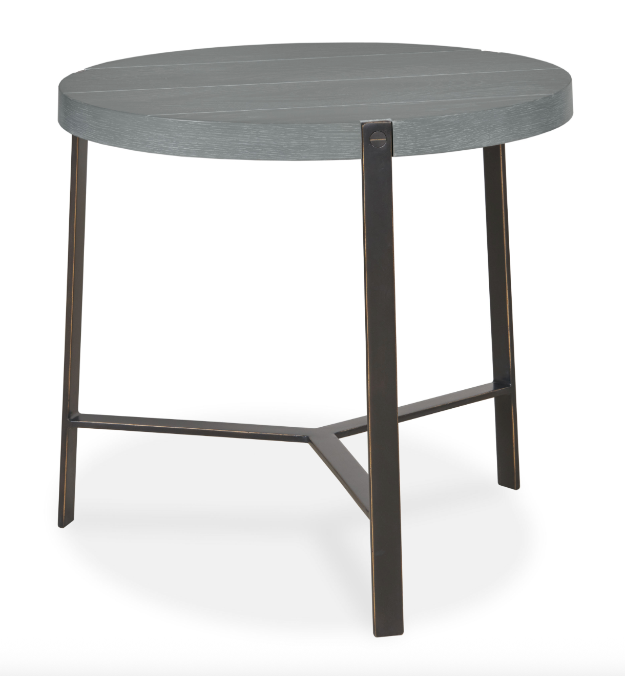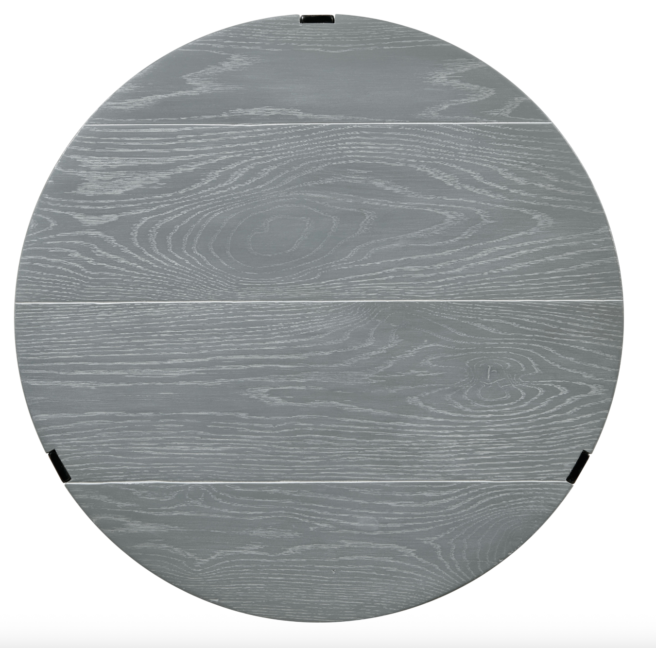Oak solids and placage planked top finished in a grey paint with white wax hang up. Oil rubbed bronze metal base