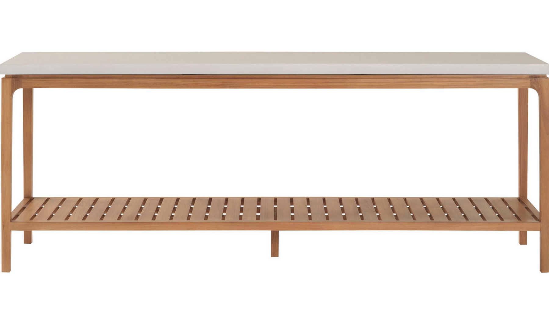 Sloop Console Table in Bianco Crema Dune top, Natural Teak finish base.