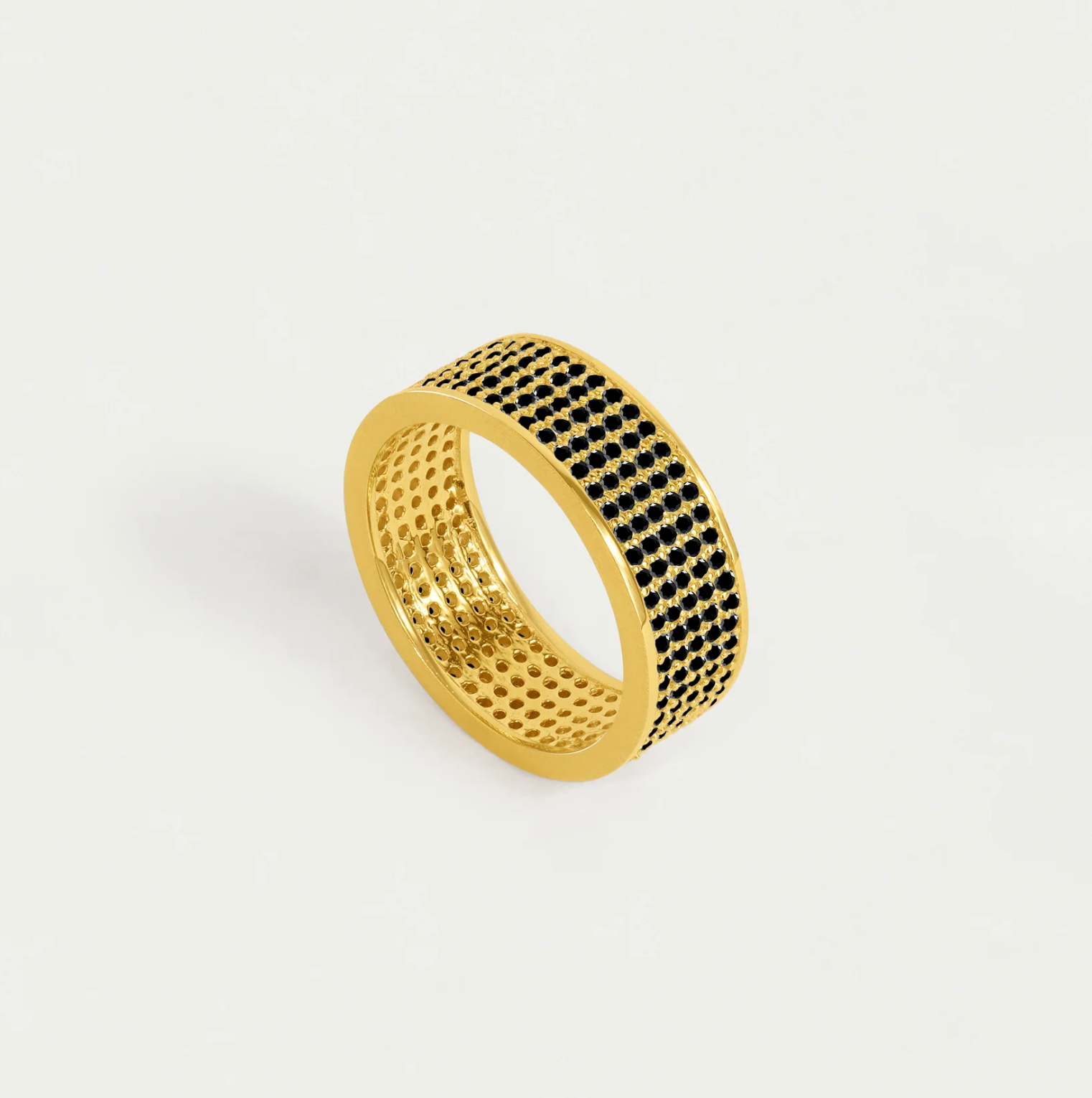 Add instant glamour to your stack with the Black Cubic Zirconia-adorned Petit Pavé Thick Stacking Ring, complete with 5 rows of hand-faceted stones.