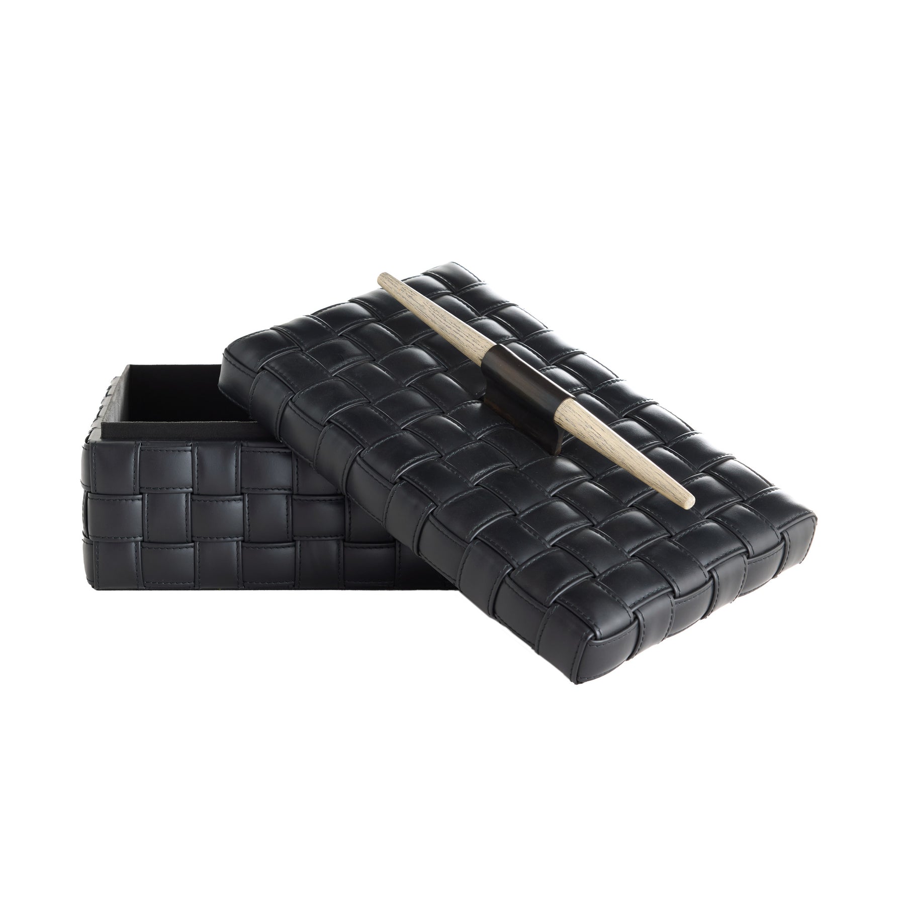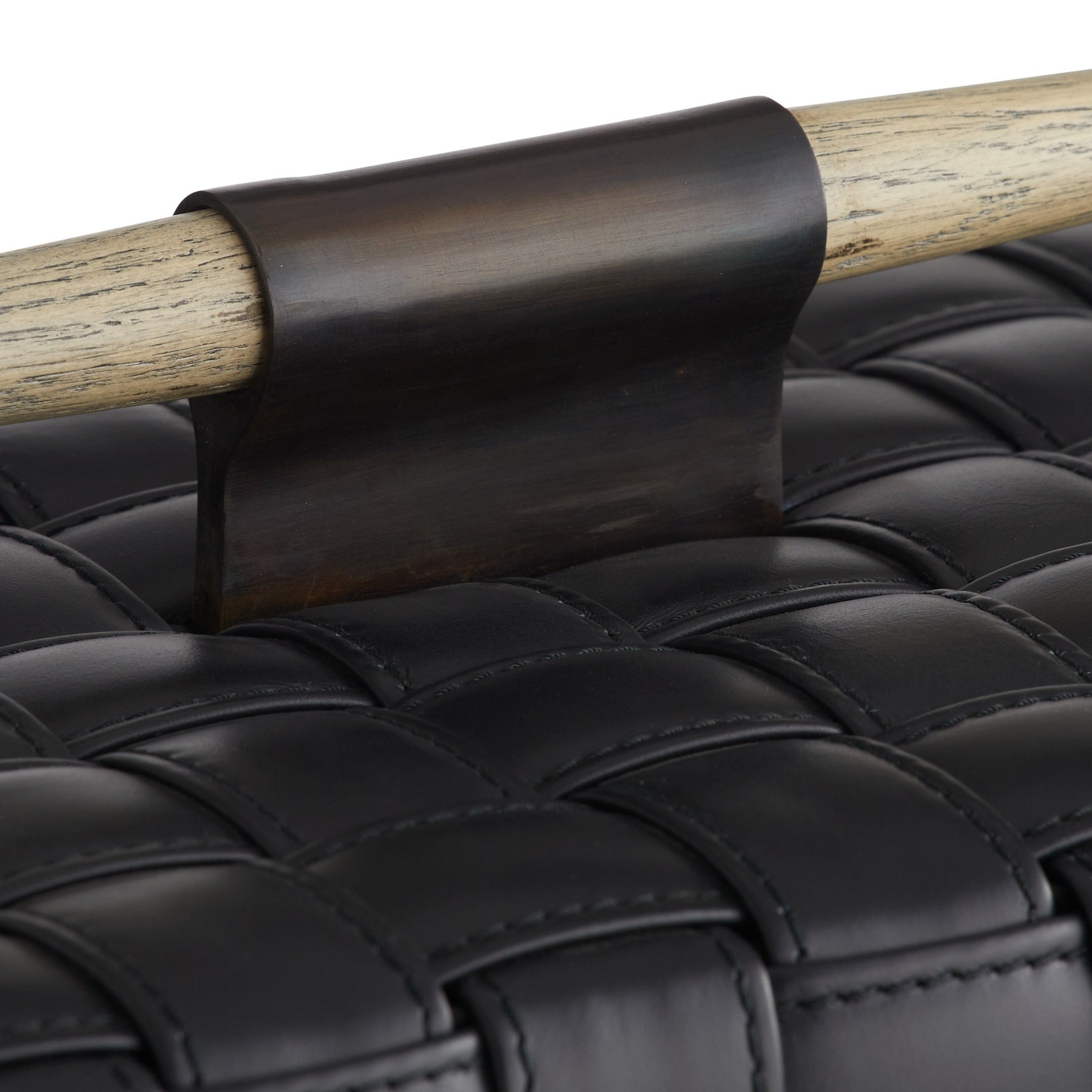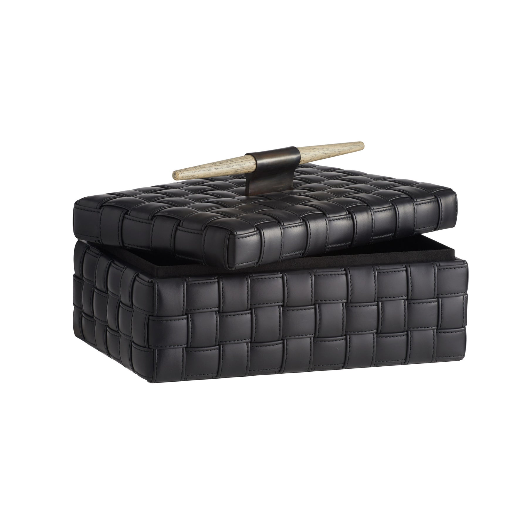 The Humphrey Box is wrapped in a basketweave pattern of topstitched black leather. Accented with a spear-shaped handle of bronze-plated iron and smoke finished beechwood, it lends a masculine accent to a desk or tabletop.