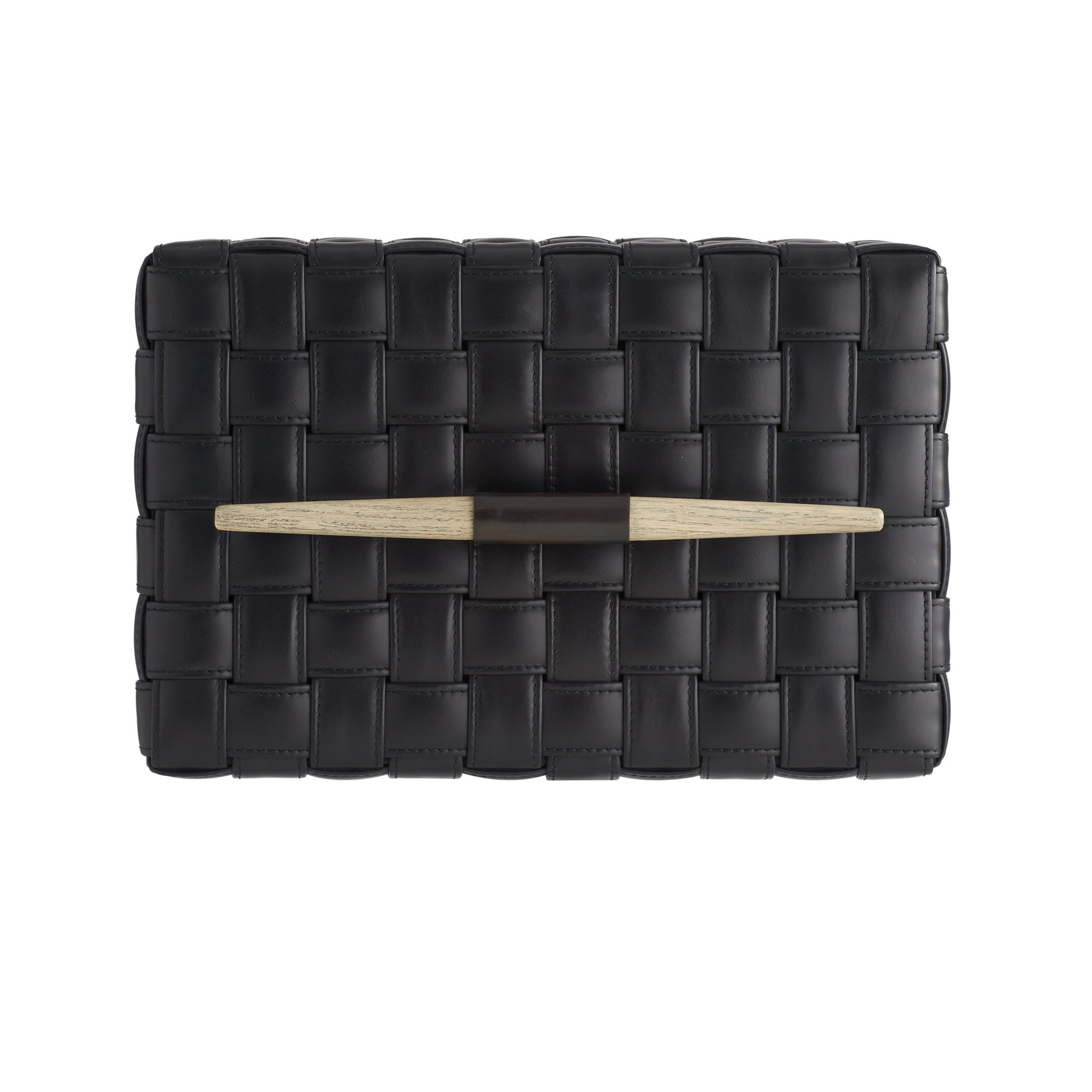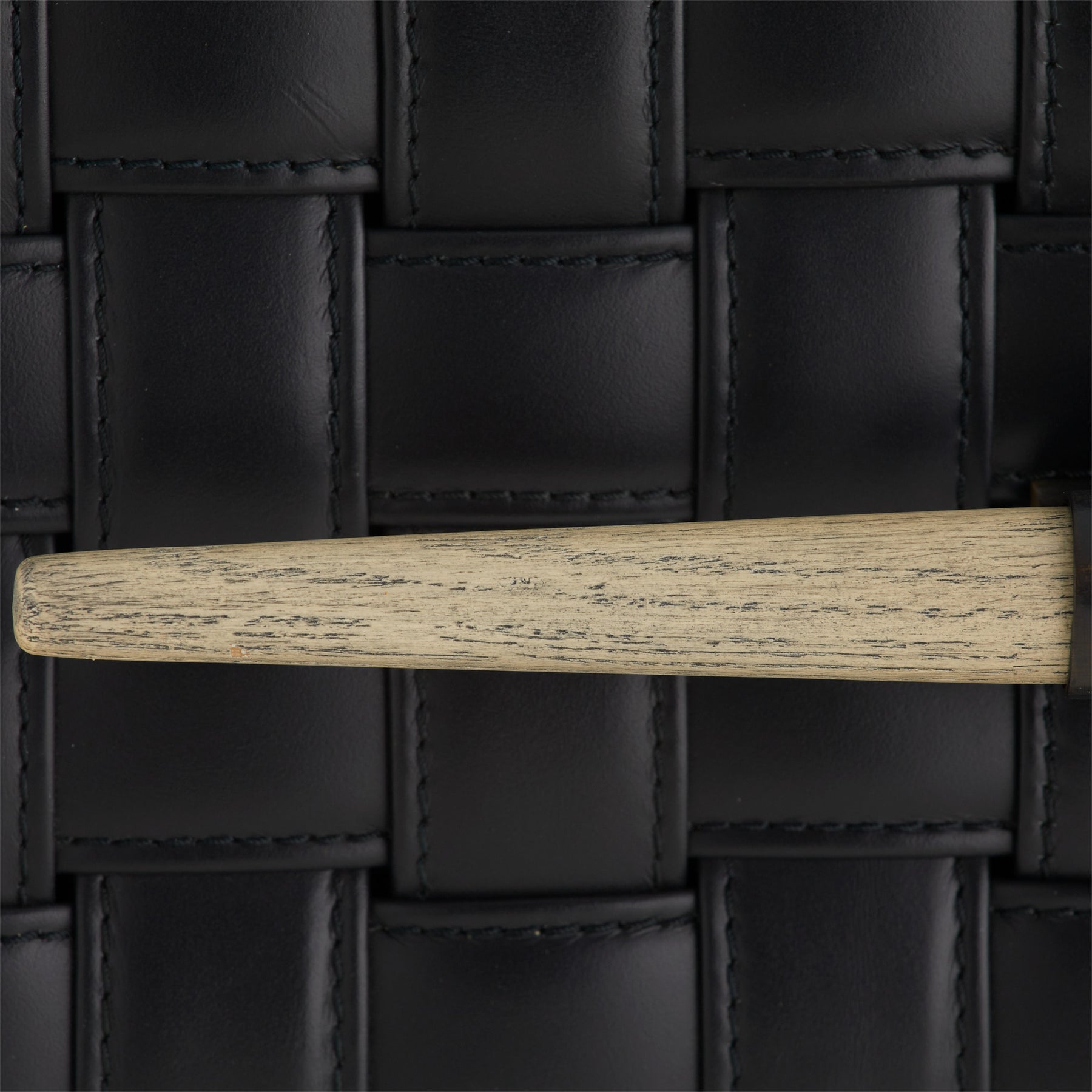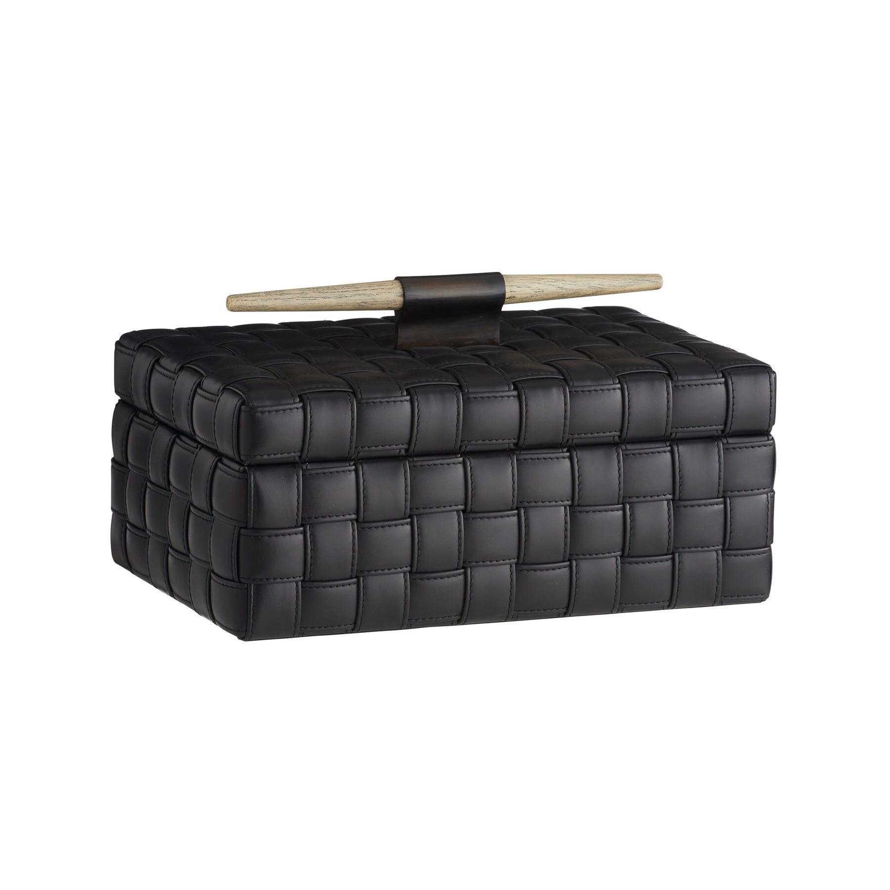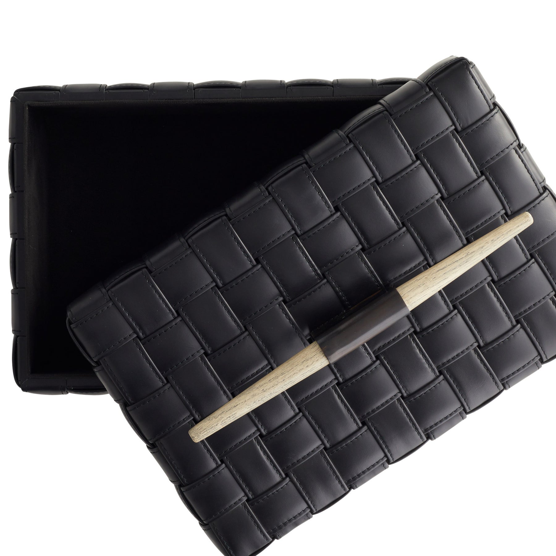 The Humphrey Box is wrapped in a basketweave pattern of topstitched black leather. Accented with a spear-shaped handle of bronze-plated iron and smoke finished beechwood, it lends a masculine accent to a desk or tabletop.