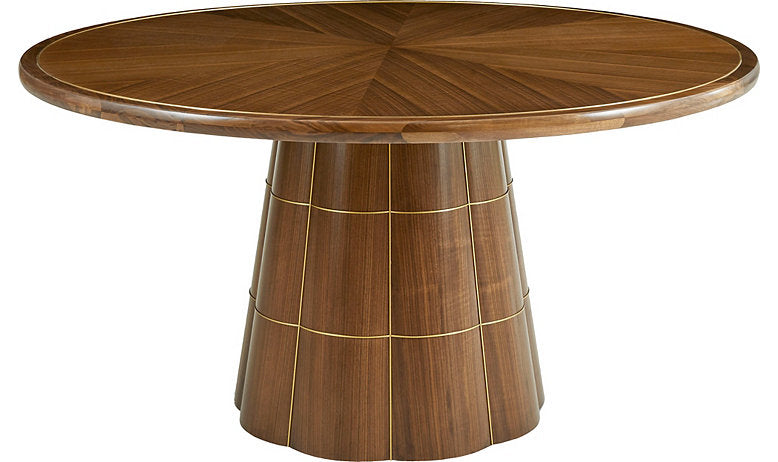 Inspired by the design of a dress form, the base of the Petal Dining Table is sculpted in walnut scallops with shimmering lines of brass. On its top, a brass inlay and a starburst of quartered figured walnut veneer are surrounded by a curved edge.