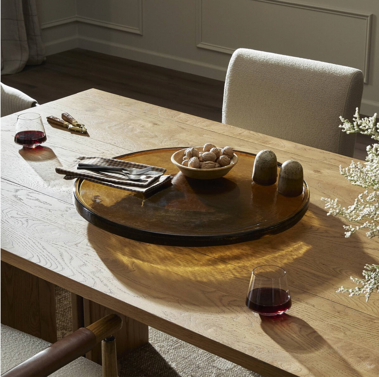 This food-safe Lazy Susan gives amber cast glass a tonal look, bringing dimension with a subtle lip around the edge.