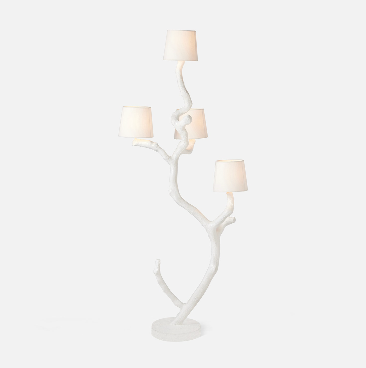 Sadira is Memphis-inspired lighting with a more subdued minimalist vibe. Its asymmetric sculptural steel base is finished with matte white gesso and accented with crisp white cotton shades.