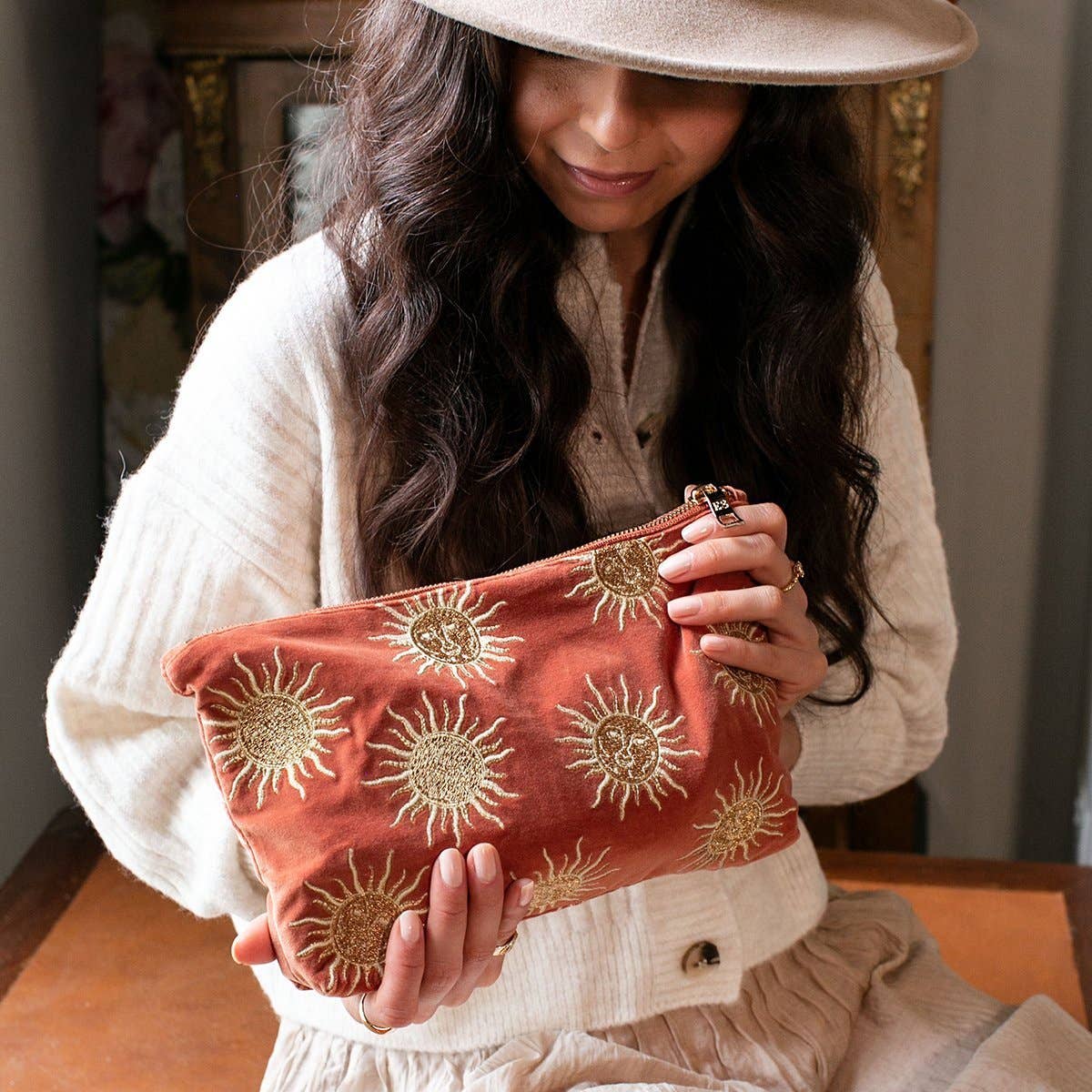 This Pouch is inspired by the warm wonders of the sun. Ideally sized, this pouch is perfect for storing your daily essentials, ideally sized to fit in your handbag or to use as a clutch.