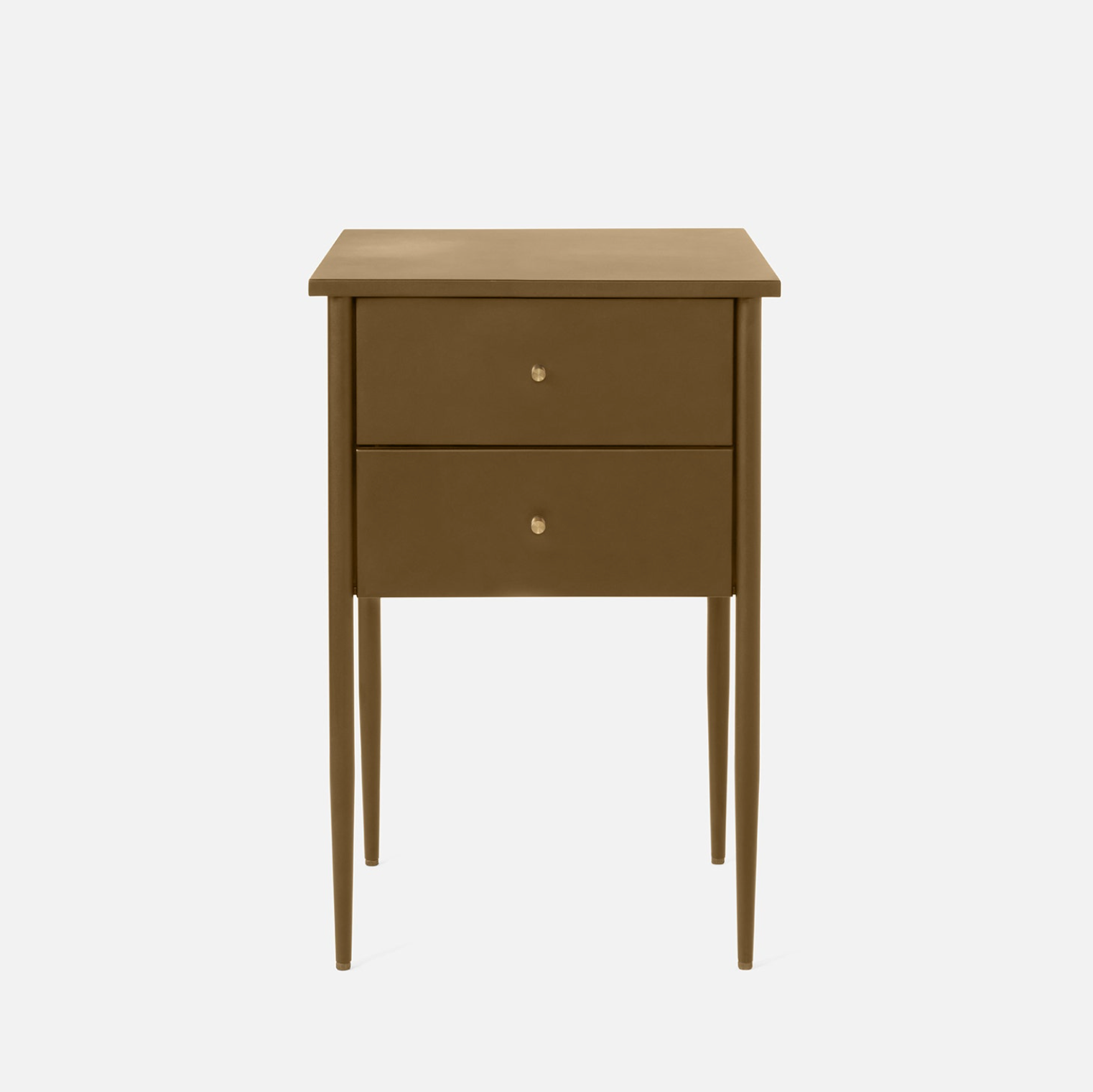 The sharp Ashwin nightstand balances a slender profile with the strength of steel. Standing on tall tapered legs, the nightstand is powder coated with a matte finish. Two drawers are perfectly complemented by diminutive brushed brass knobs. This nightstand lends versatile sophistication to any bedroom.