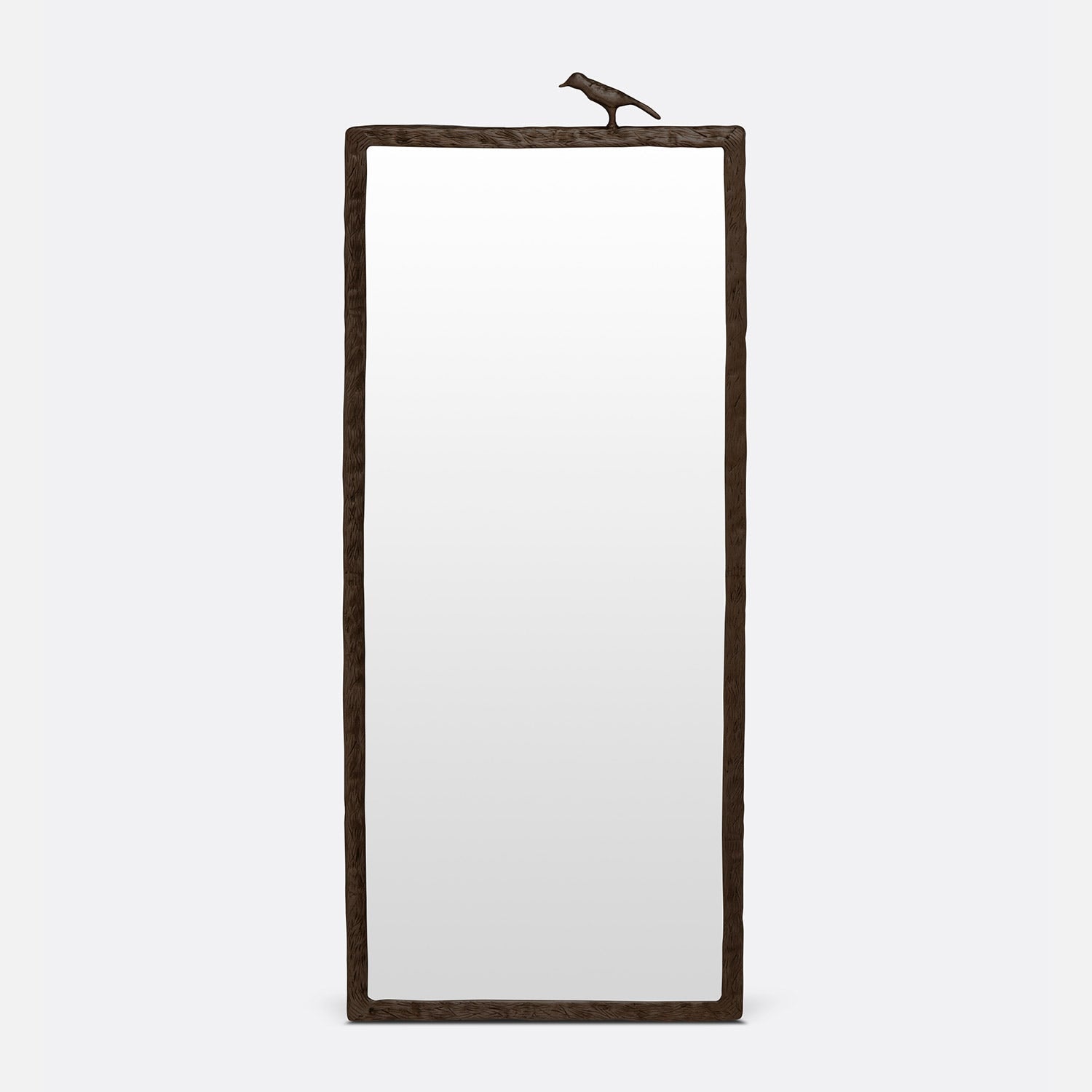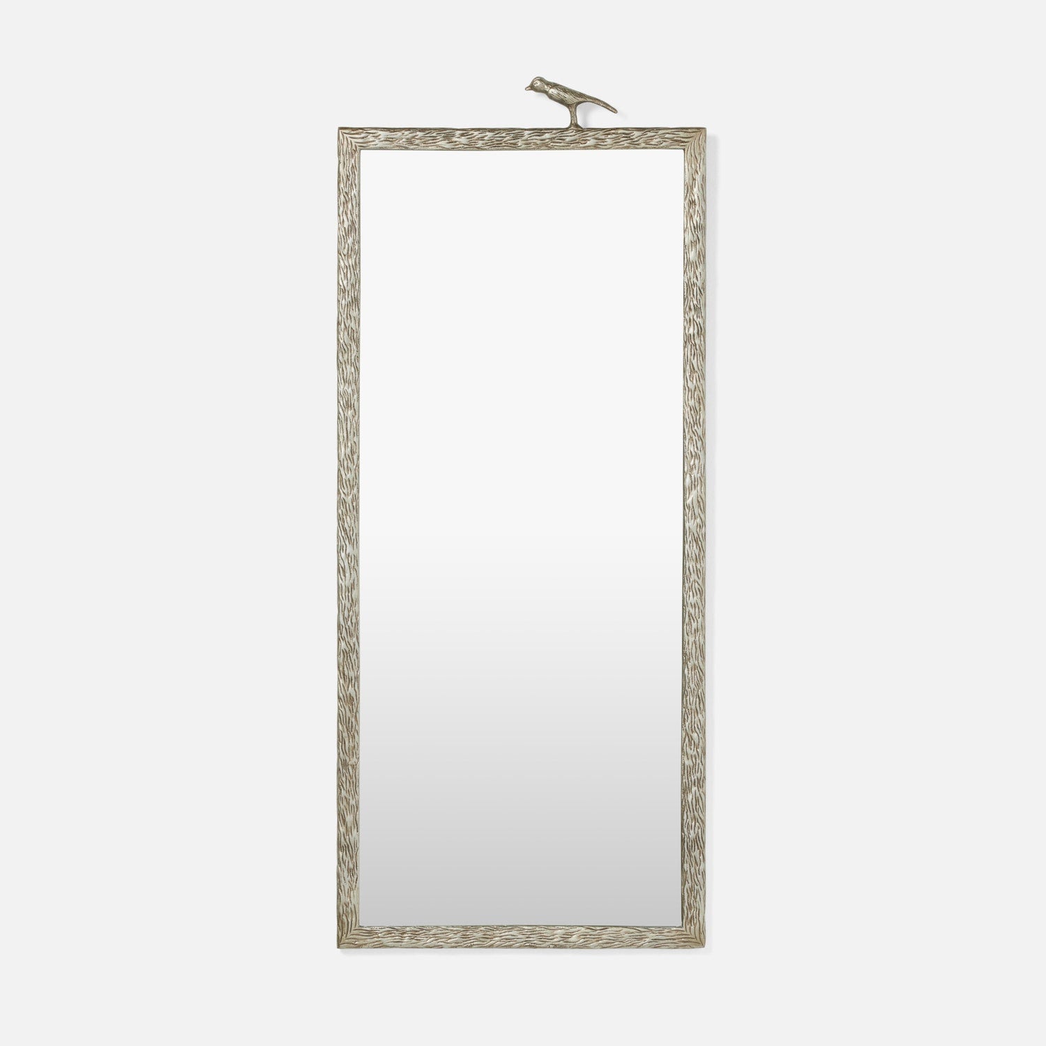 This mirror is bordered in textured metal reminiscent of wood grain. Small sparrows perch on top.