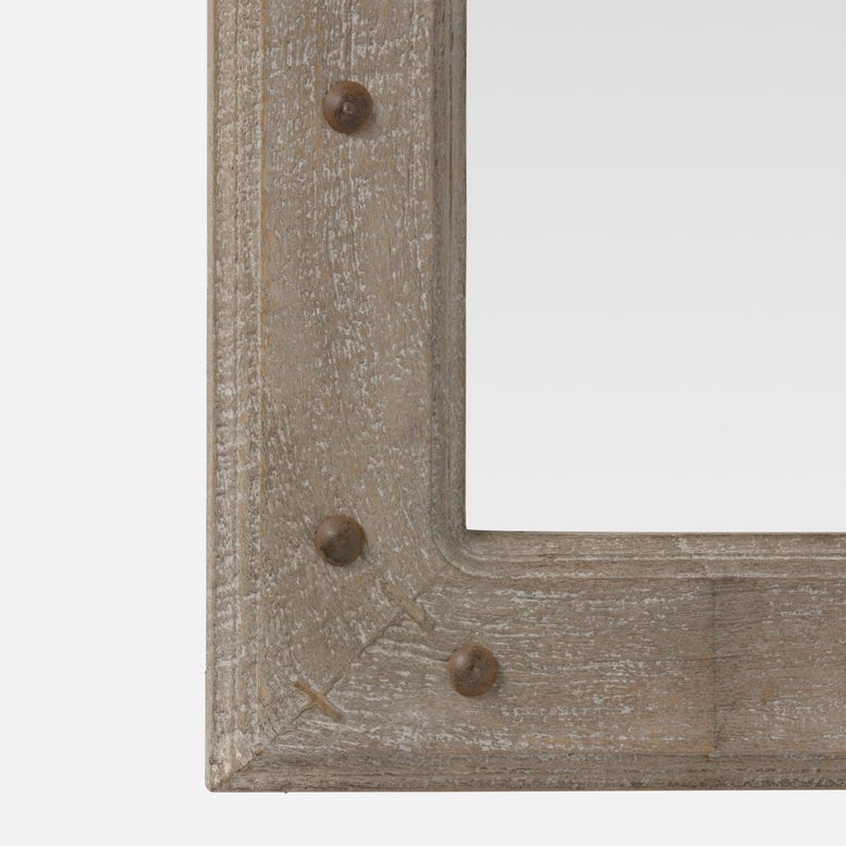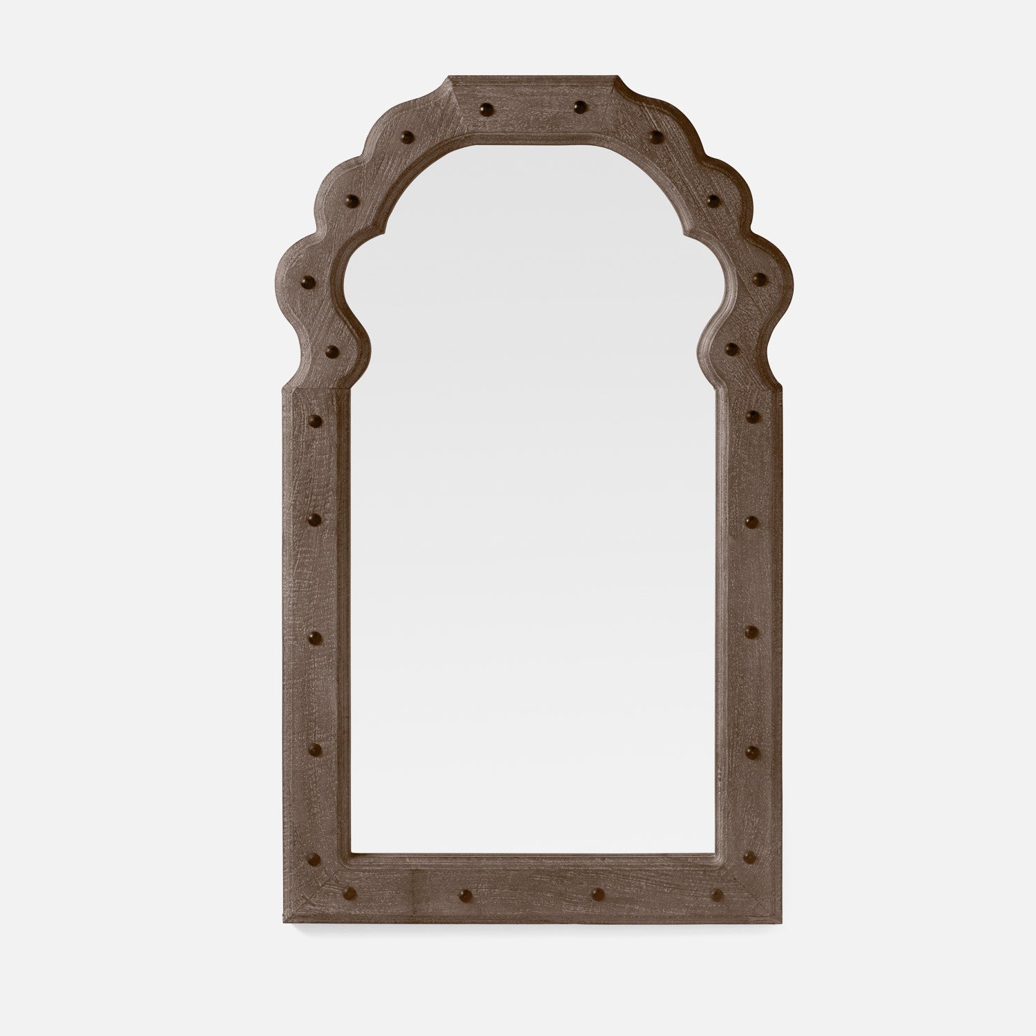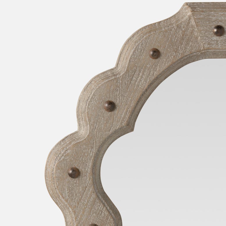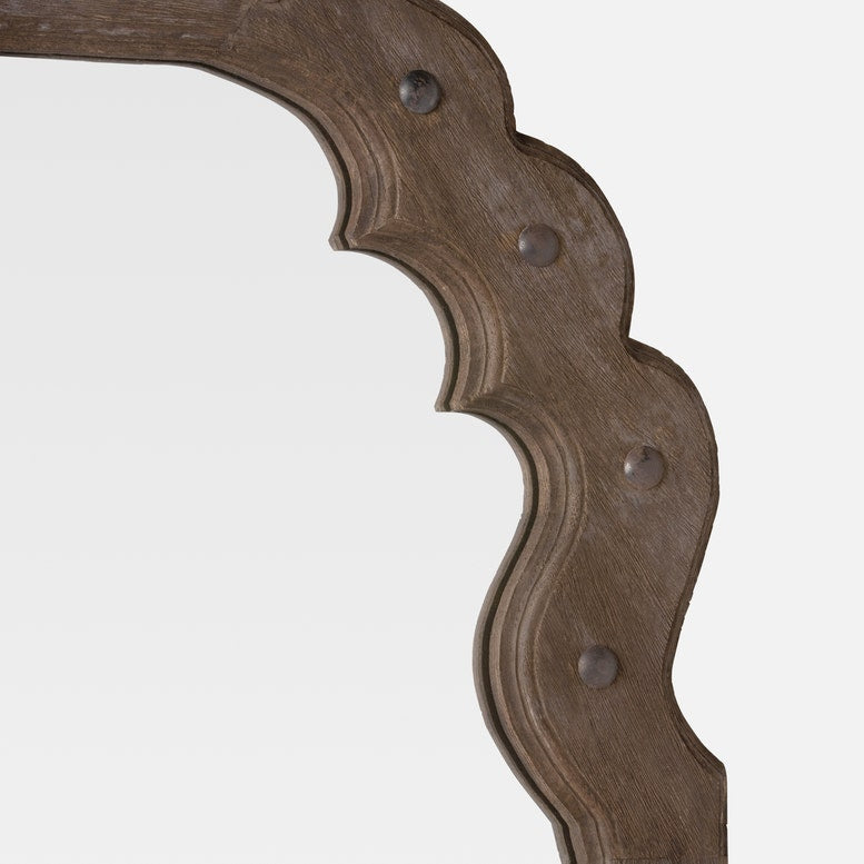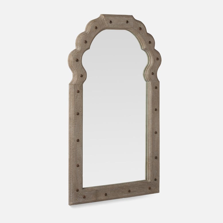 The new Kearney collection gives a nod to the Medieval aesthetic with a mango wood frame accented with brass rivets in a shape that flourishes at the top.
