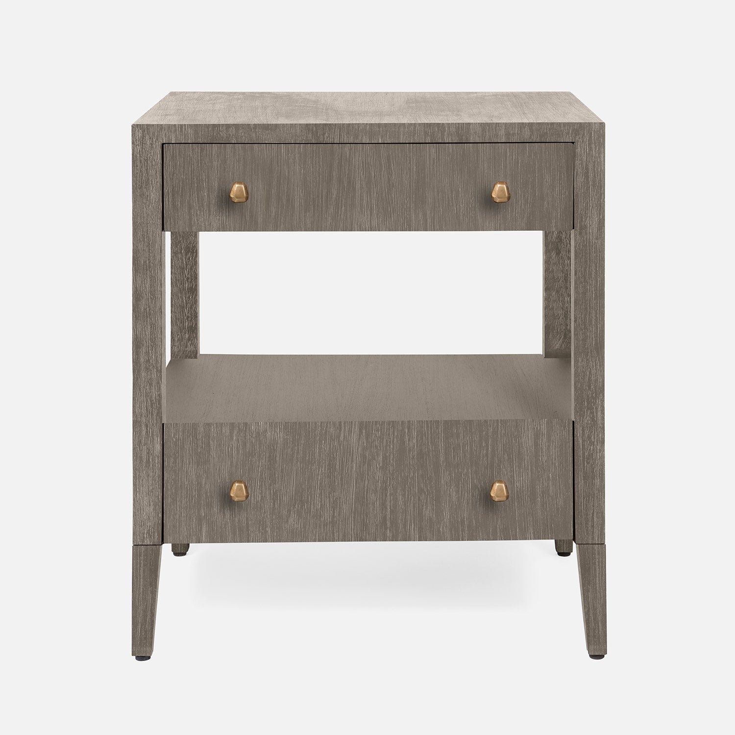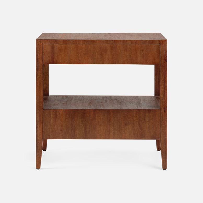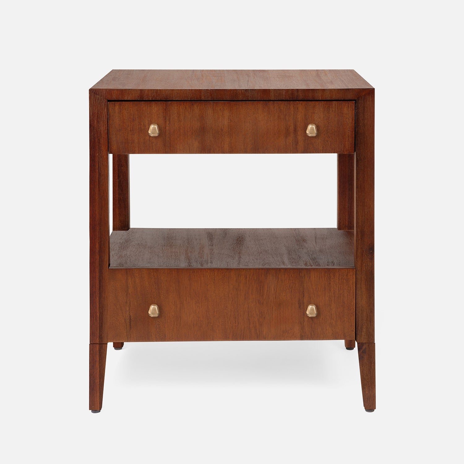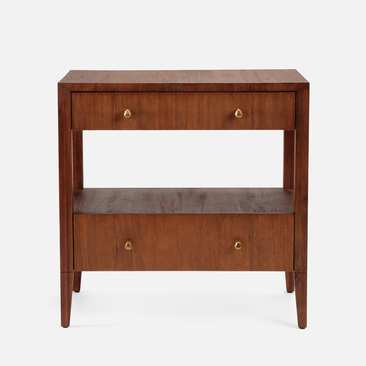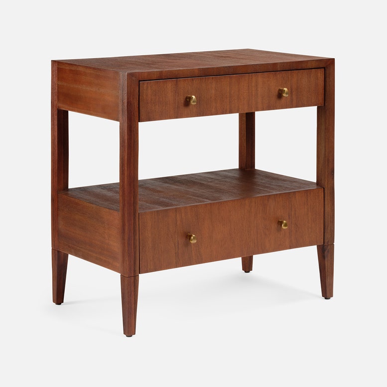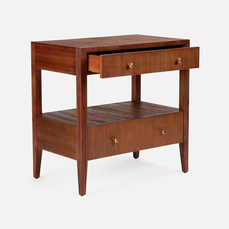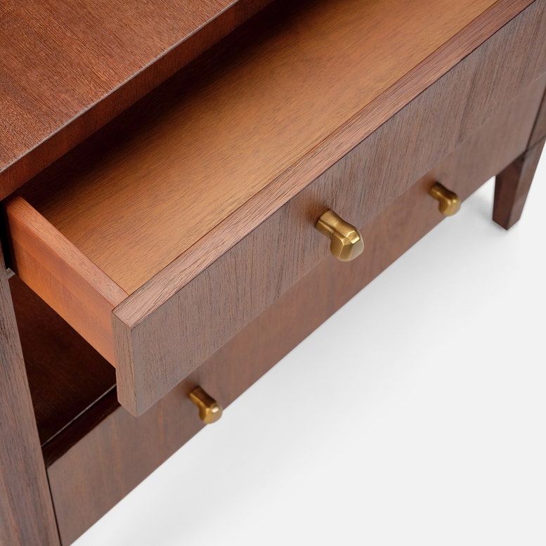 Open shelving paired with a double-drawer design creates balanced proportions for the Solaris nightstand. Abstract brass knobs and distinctive grain patterns in Brazilian wood make each piece truly one of a kind.