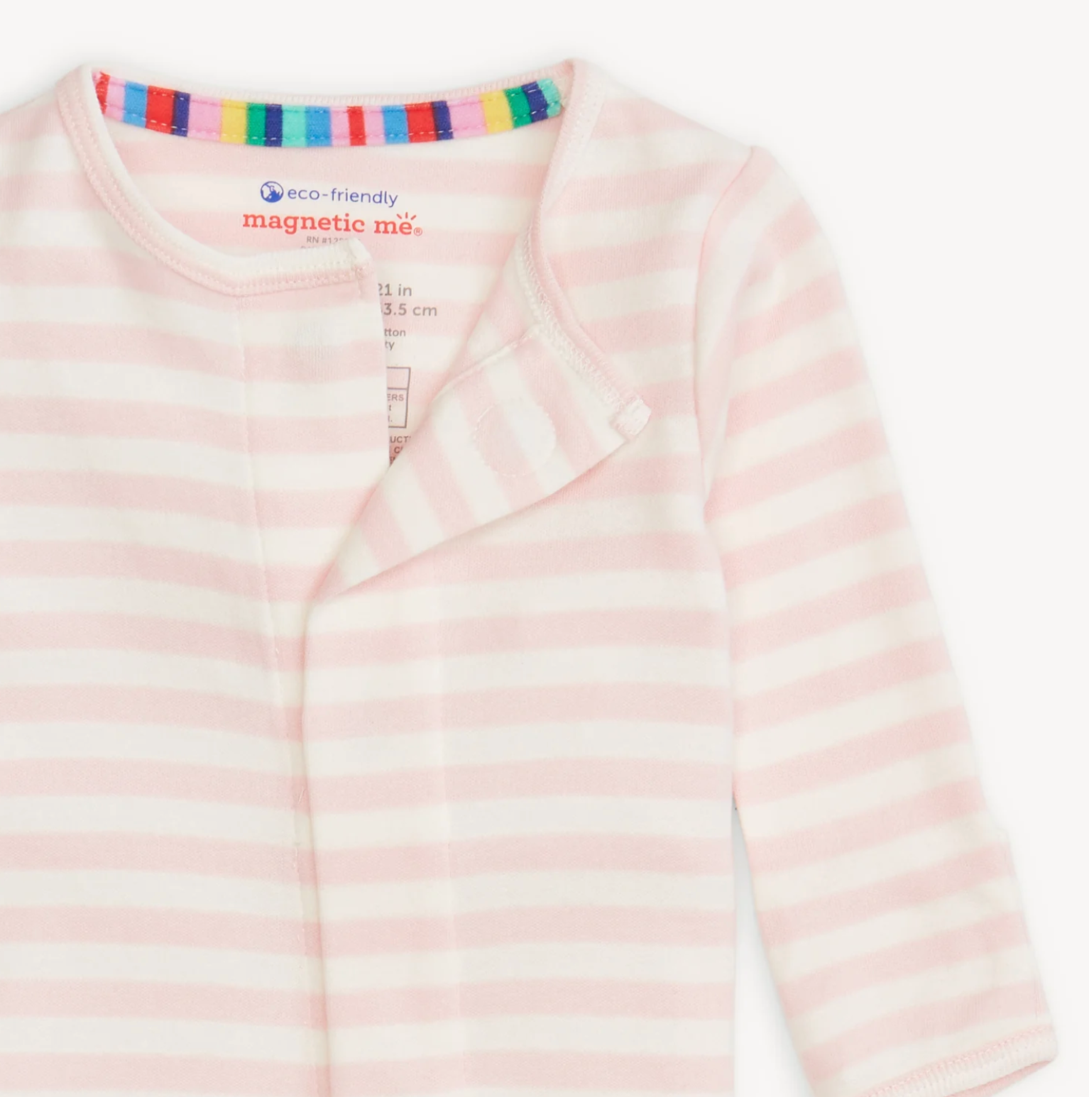- Magnetic closures: magnets line the seam from the neck to upper thigh for sizes up to 0-3m & from neck to crotch for sizes 3-6m and up.