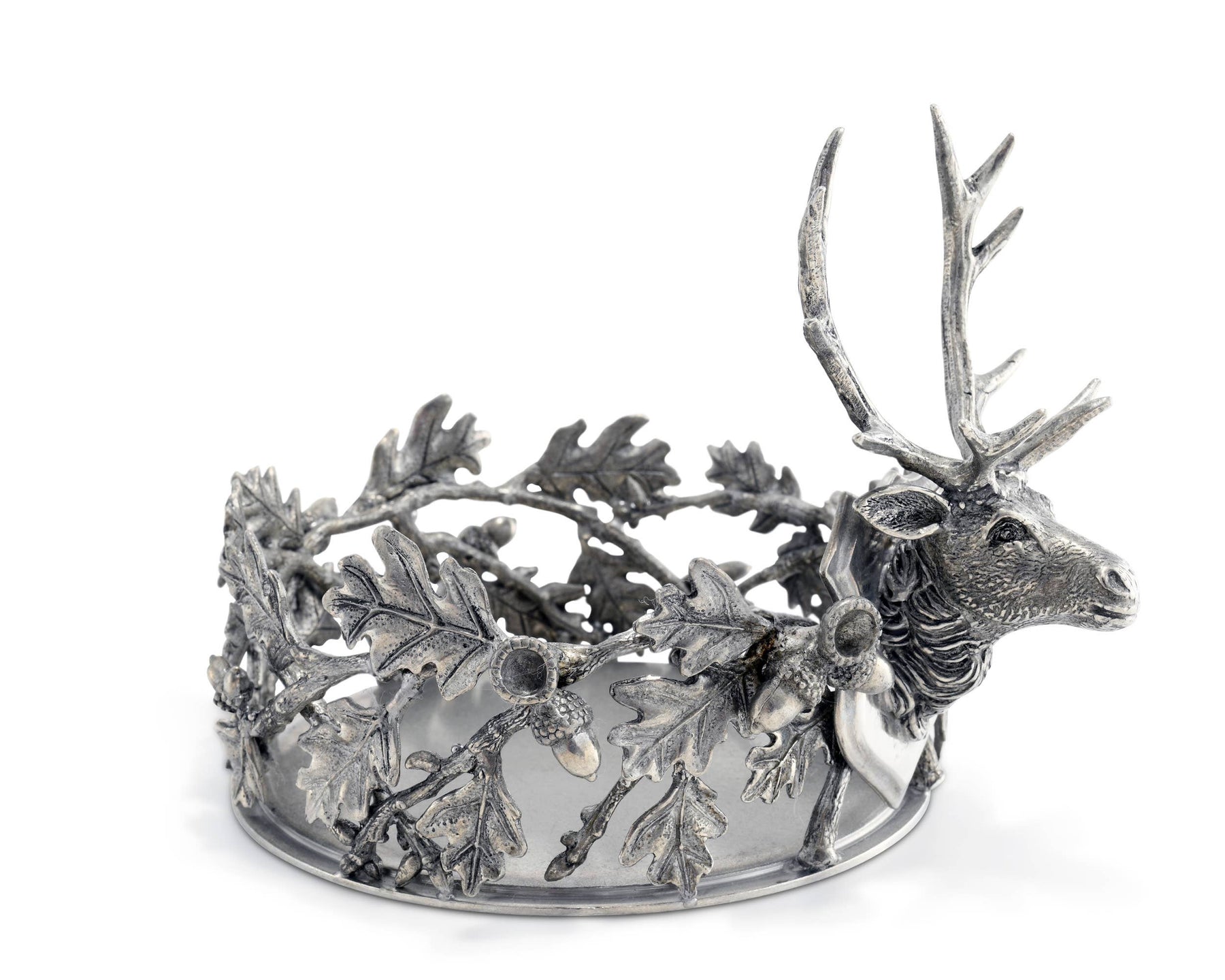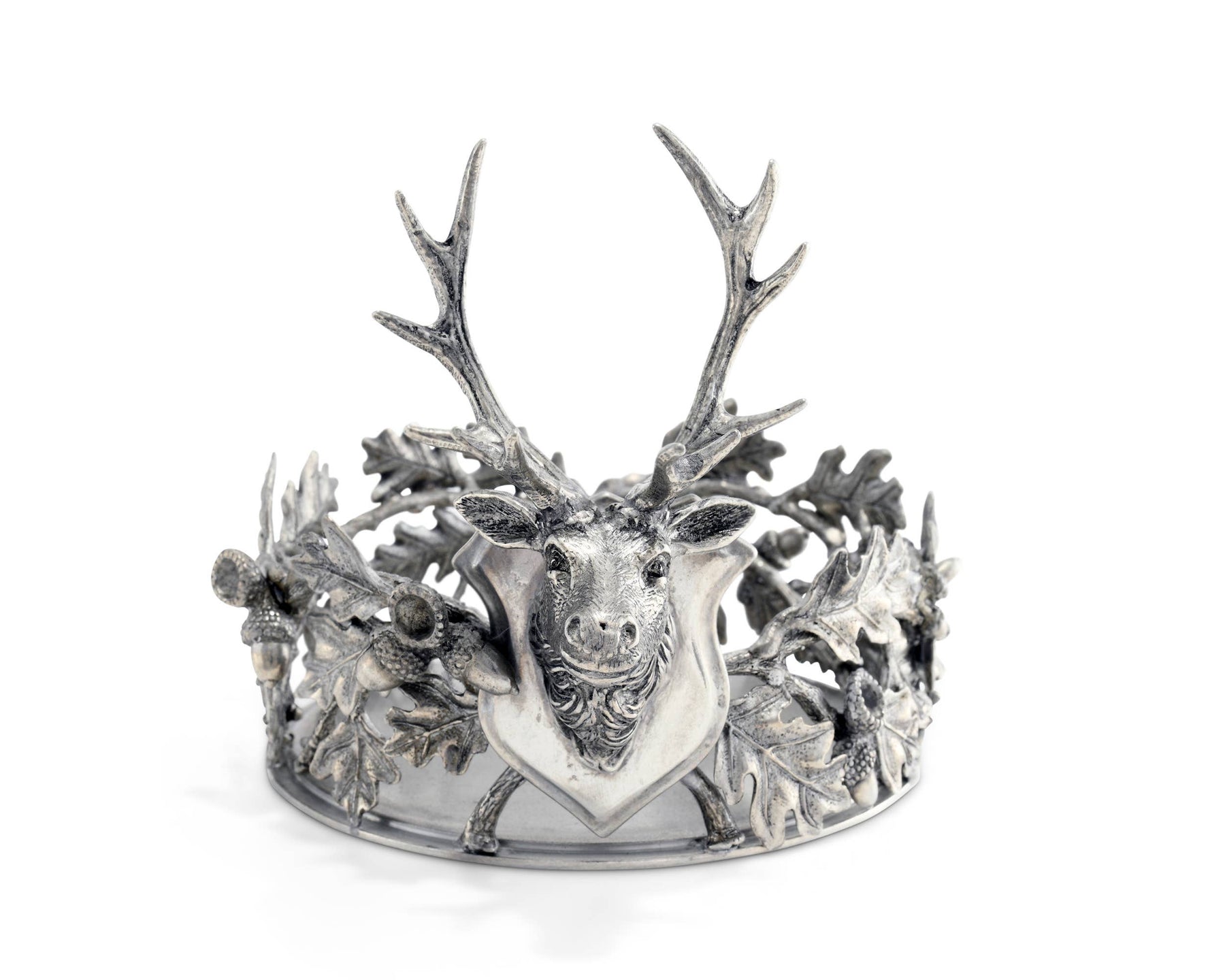 Hand-cast and finished in luxury grade pewter, artistic details include an intricate wreath of tiny acorns and oak leaves to surround your wine bottle. A 3-D stag head sporting a full rack of magnificent antlers adds gravitas and rustic style. e.