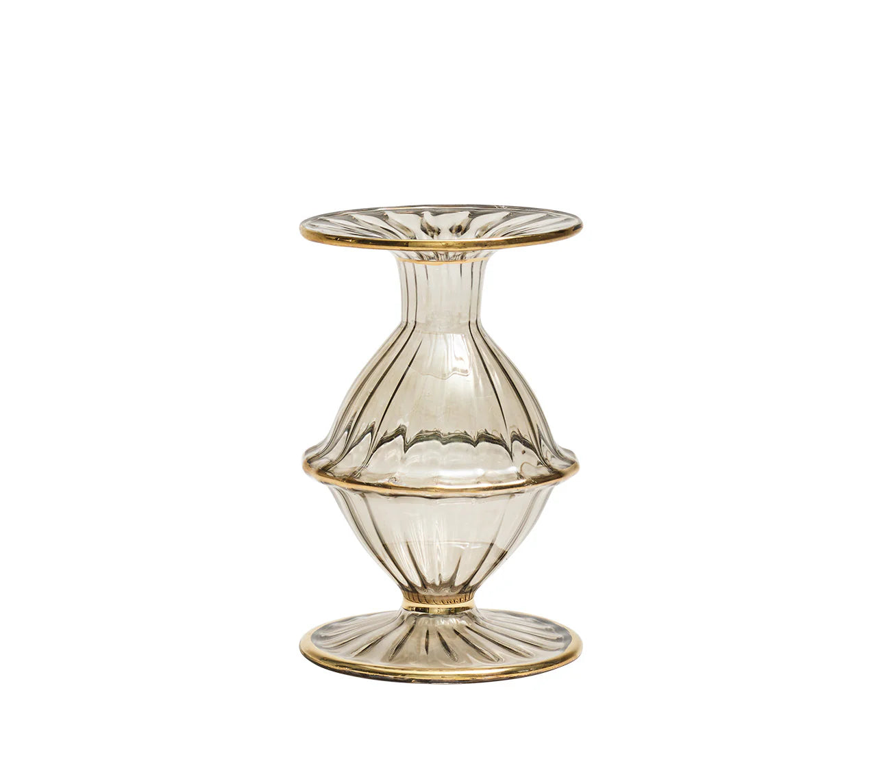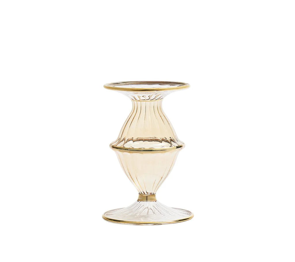 The mouth-blown, hand-molded glass Blossom Candlestick features a center globe. Hand-applied color baked at high temperatures produces a stunning iridescent luster. The rim and foot are accented in 18K gold, elevating this classically sophisticated style. Expect shape, size, and color variation due to their hand-crafted nature.
