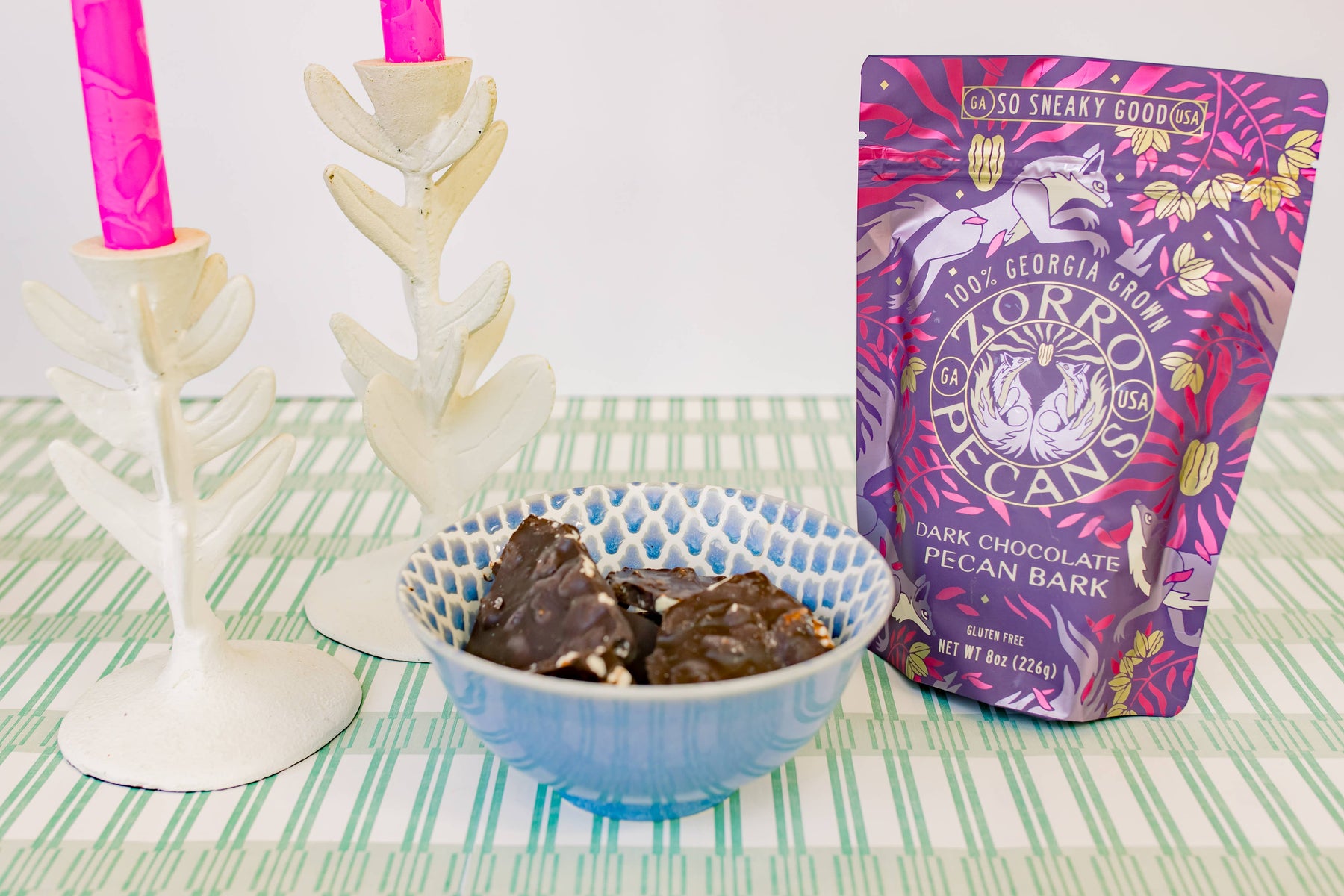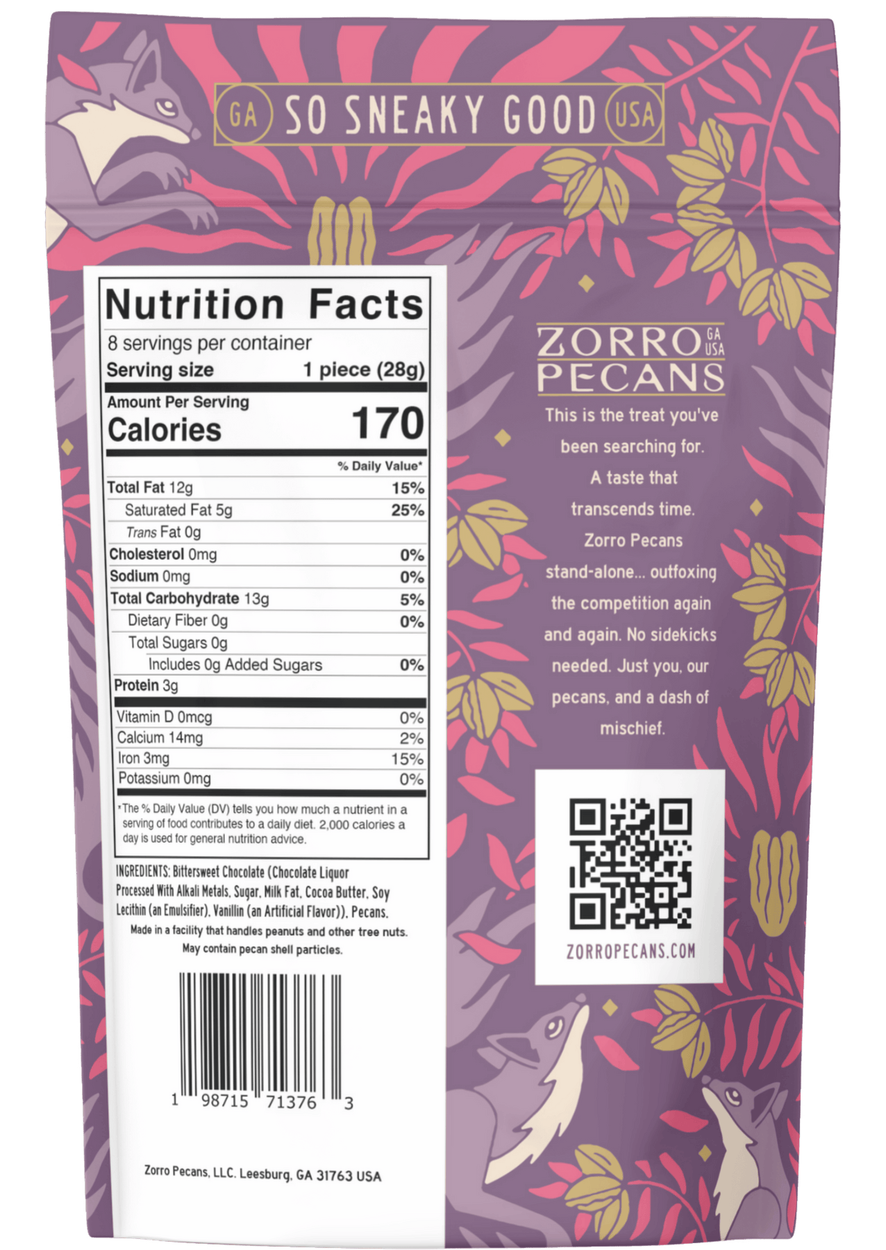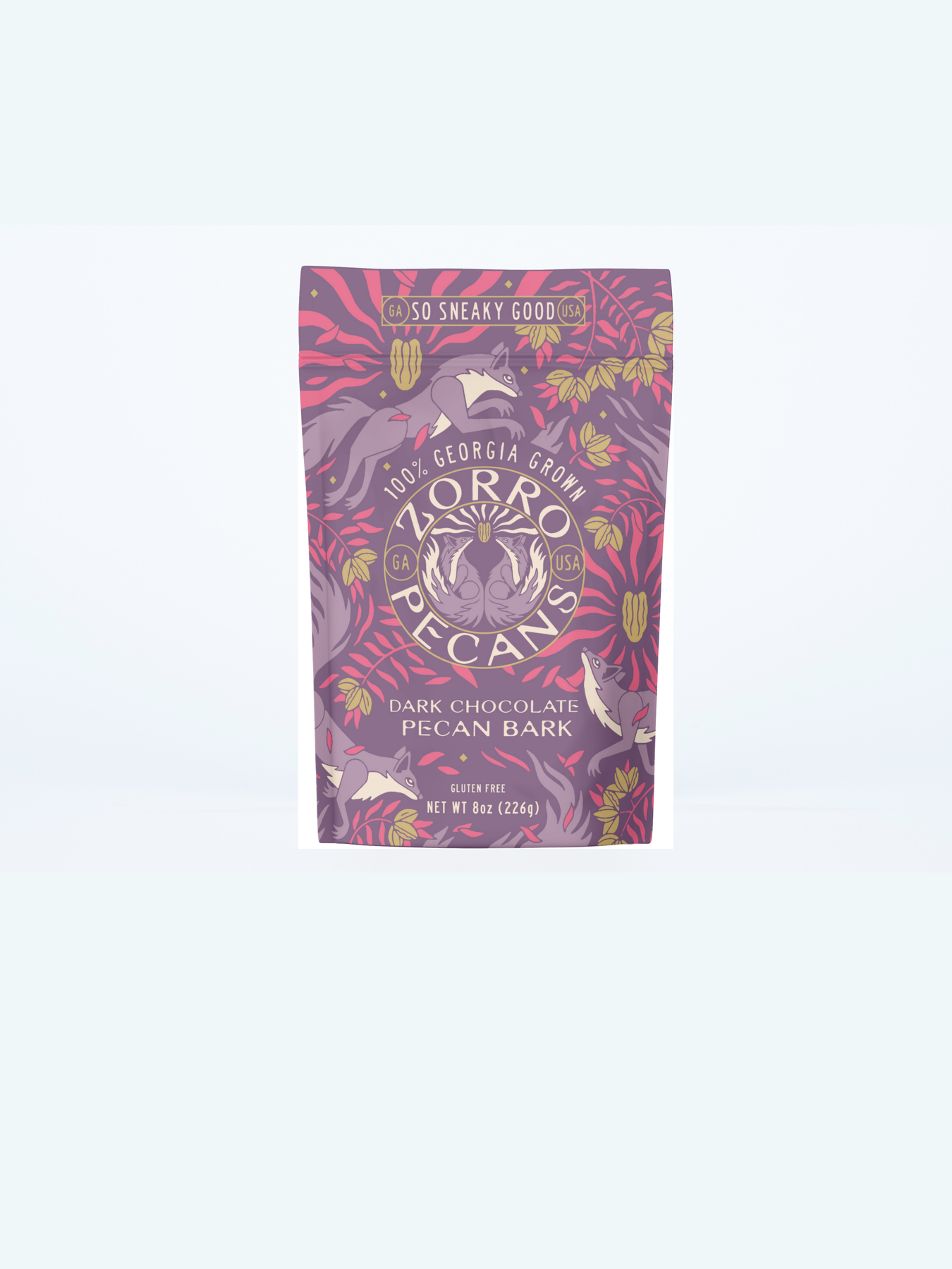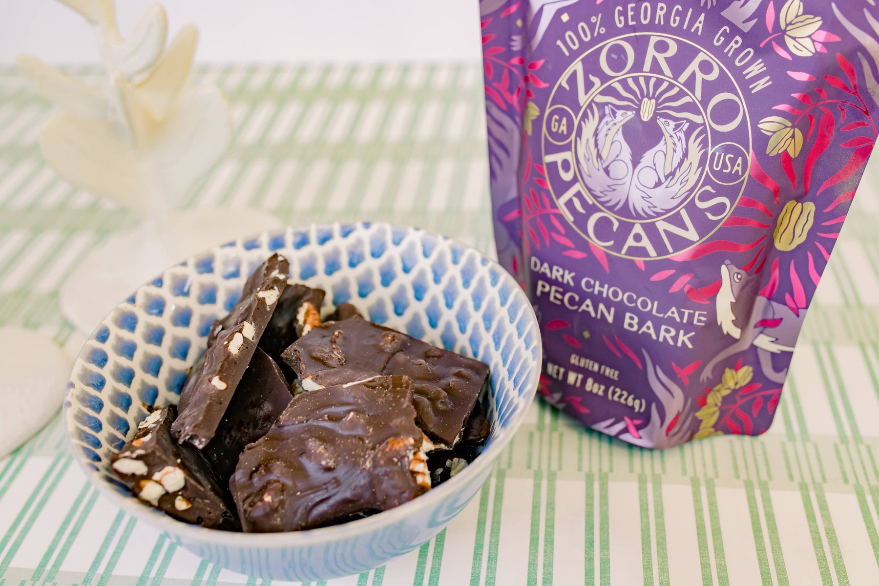Dark Chocolate Pecan Bark...decadent, smooth chocolate and fresh crunchy pecans! Pairs beautifully on shelves with Sweet and Spicy. Eye catching for store shelves in gourmet grocery, resorts, or boutiques. Each crunchy bite of Zorro Pecans is a symphony of flavor; perfect for any occasion, or no "occasion" at all!