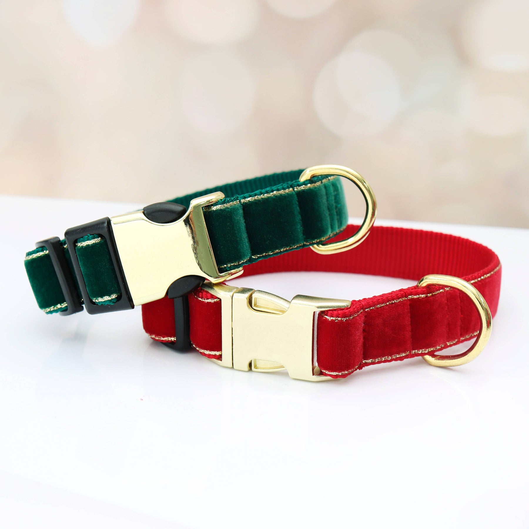 Elevate your dog's holiday wardrobe with this luxurious velvet collar, featuring elegant gold trim in festive red, green, and navy hues. The sturdy, washable velvet construction maintains its beauty through regular wear, while the reinforced nylon webbing backing ensures durability and easy care.