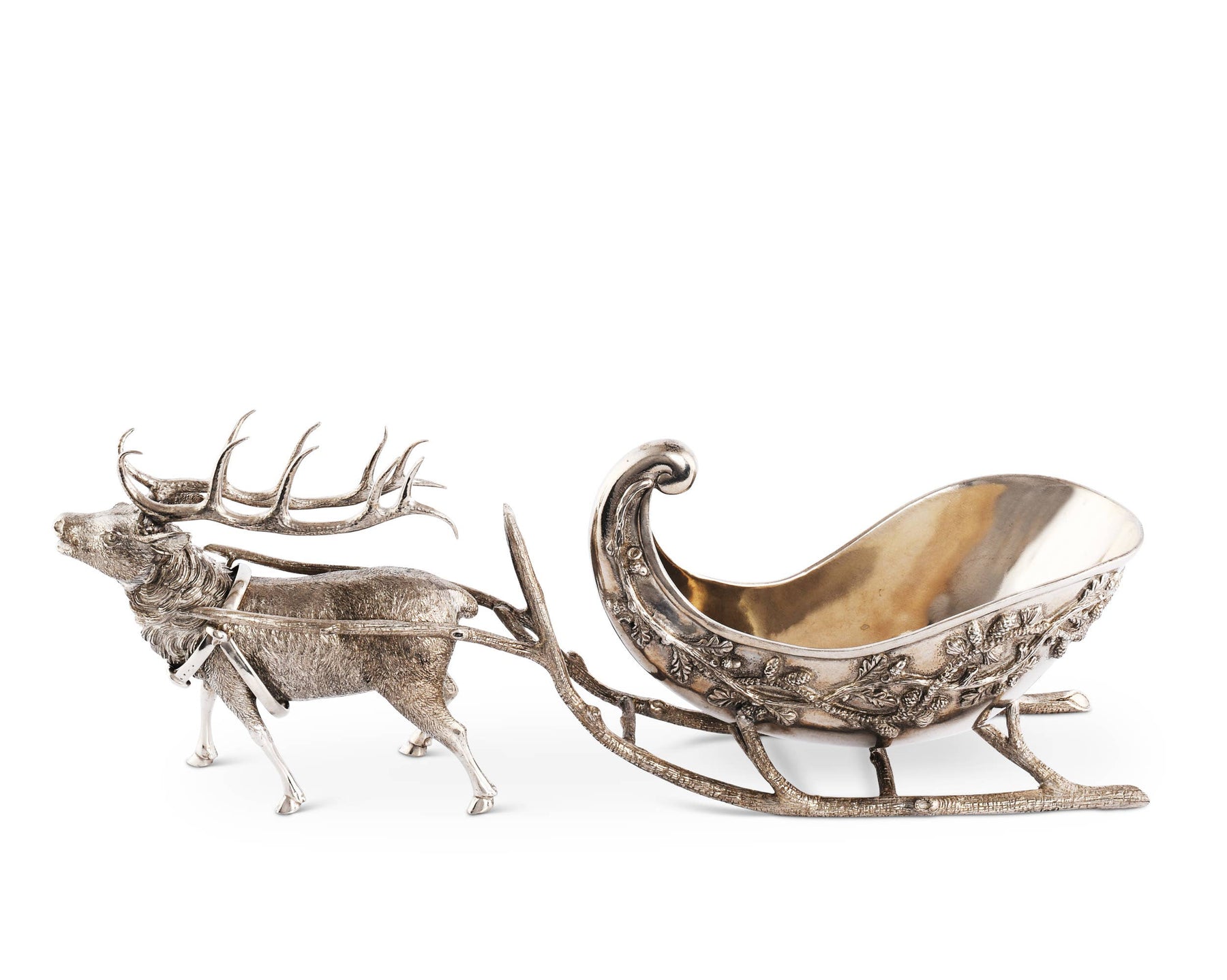 Artistry in luxury pewter, our Reindeer Sleigh Centerpiece features a highly detailed pewter reindeer figural pulling an old fashioned, branch runner sleigh to fill with flowers, candies, nuts, any holiday delight you desire. The sleigh features mezzo-rilievo decoration of boughs, pine cones and holly bouquets. A holiday decoration that will become a family heirloom to treasure through the years, this piece adds subtle élan to your holiday home décor.