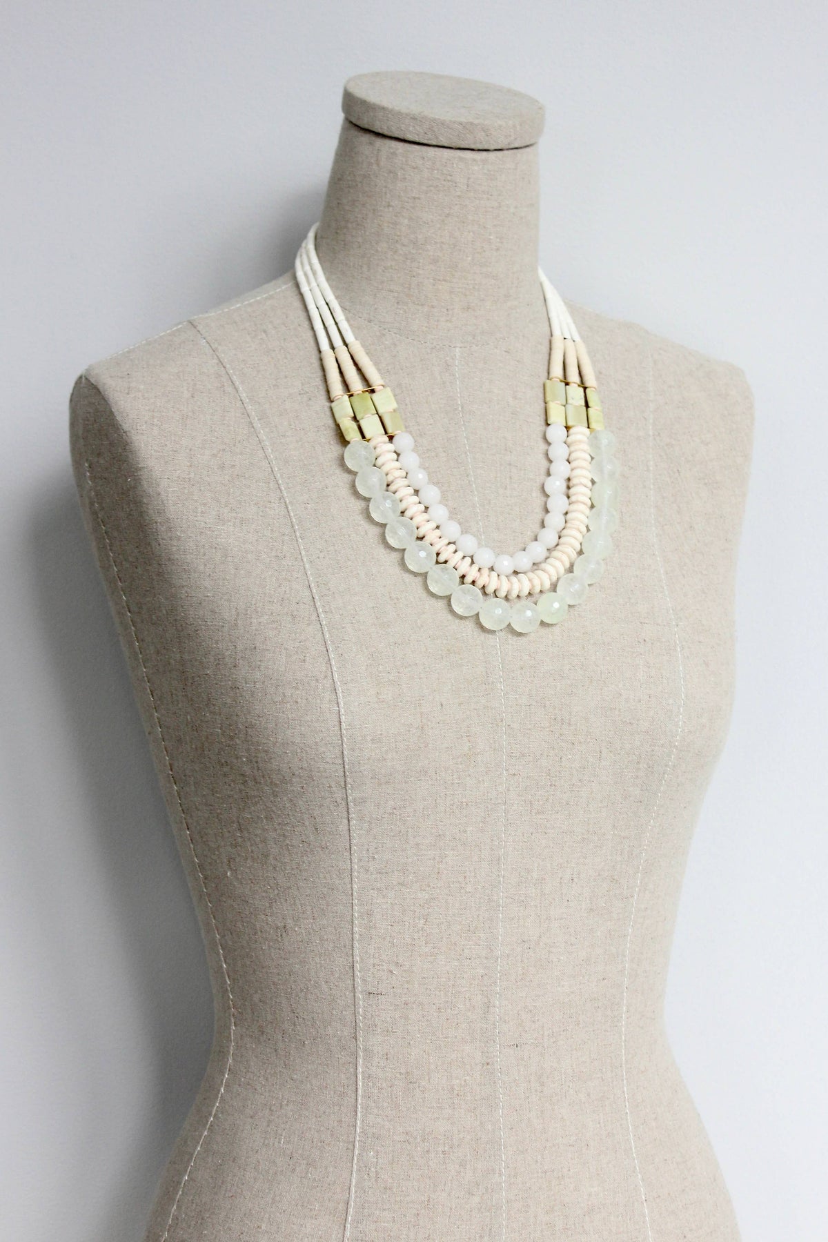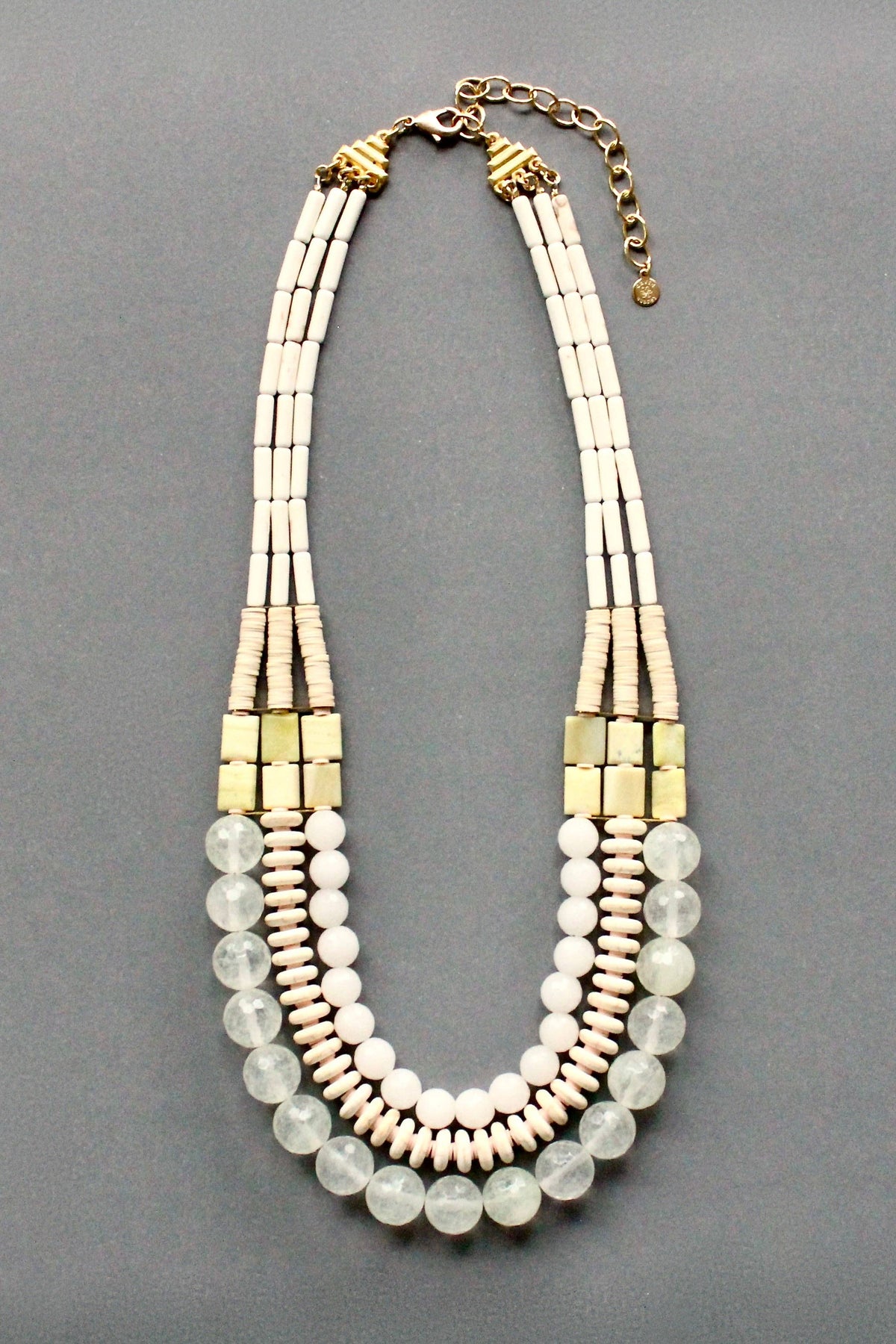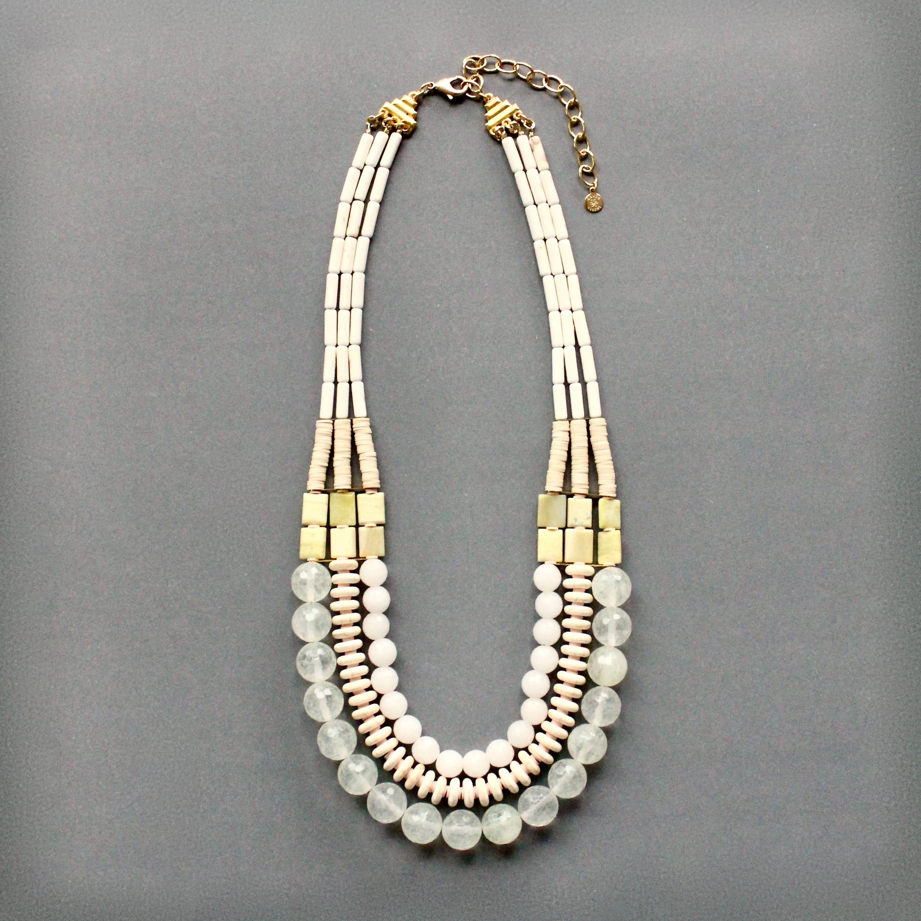 The triple strand necklace with magnesite, vulcanite, serpentine, jade and quartz.