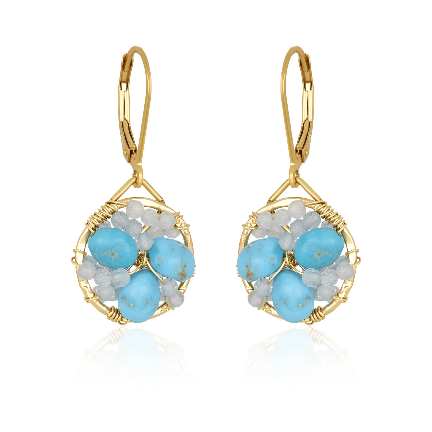 Three daring turquoise beads are meticulously wired with brilliant white topaz in a captivating wheel formation, secured with a strong gold-filled lever clasp.