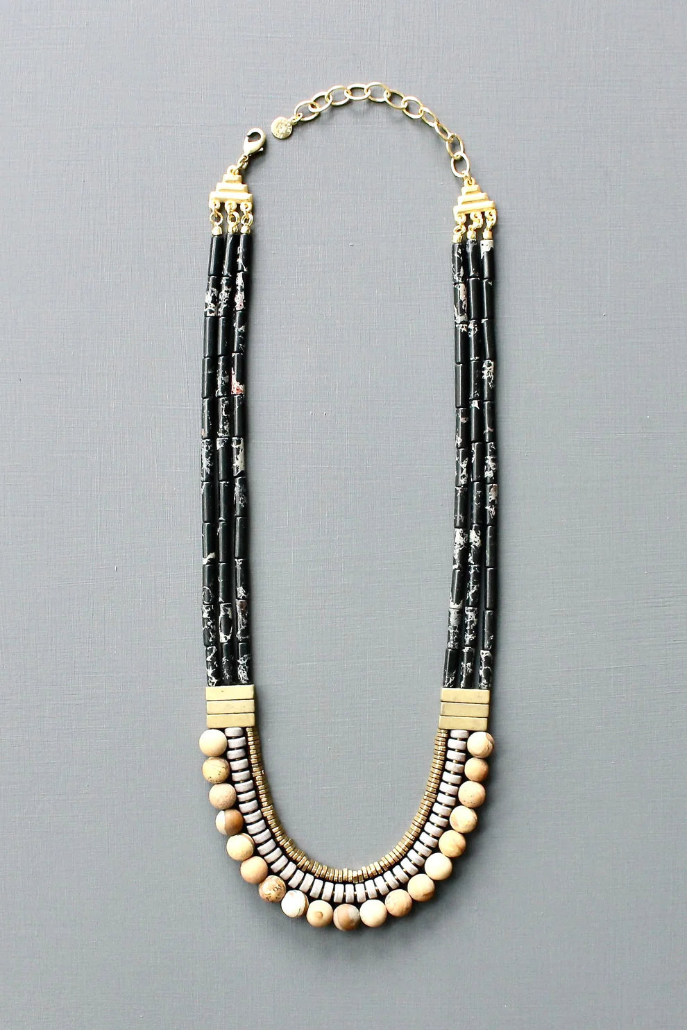 The triple-strand necklace with synthetic black emperor stone, hematite, magnesite and jasper.