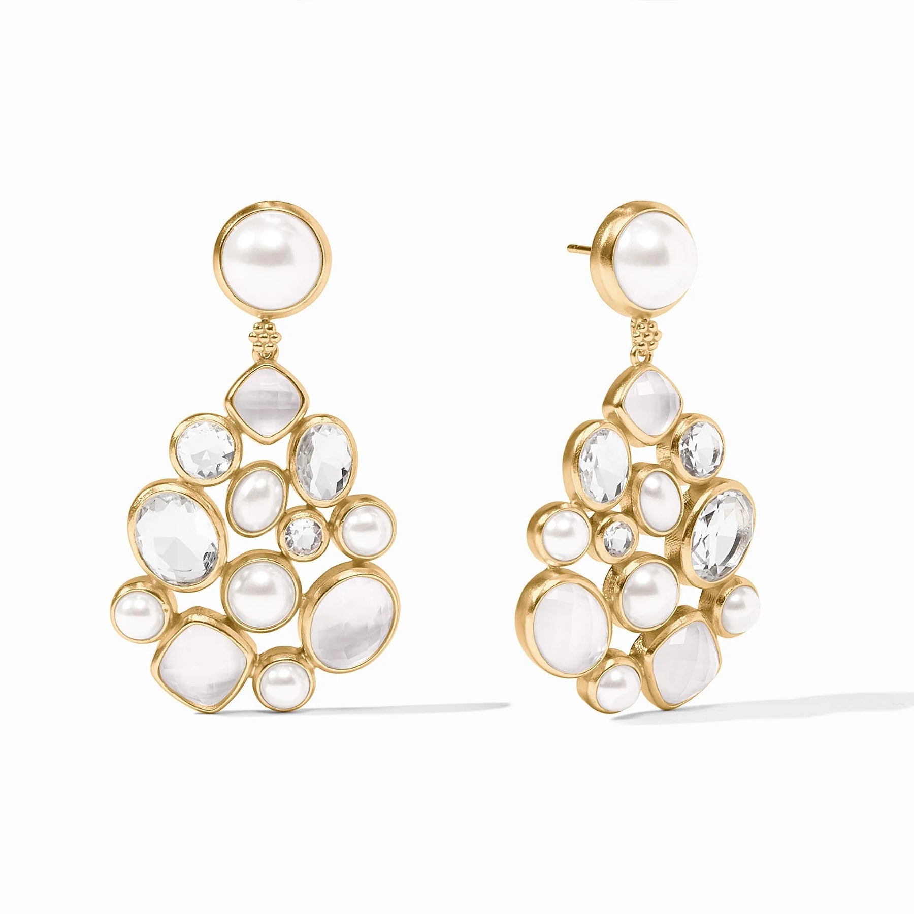 These showstoppingly sparkly earrings feature a mélange of gold-set gemstones in every size, shape, tone, and cut like bejeweled cobblestones, linked to a complementary rounded gem by a subtle granulated embellishment.