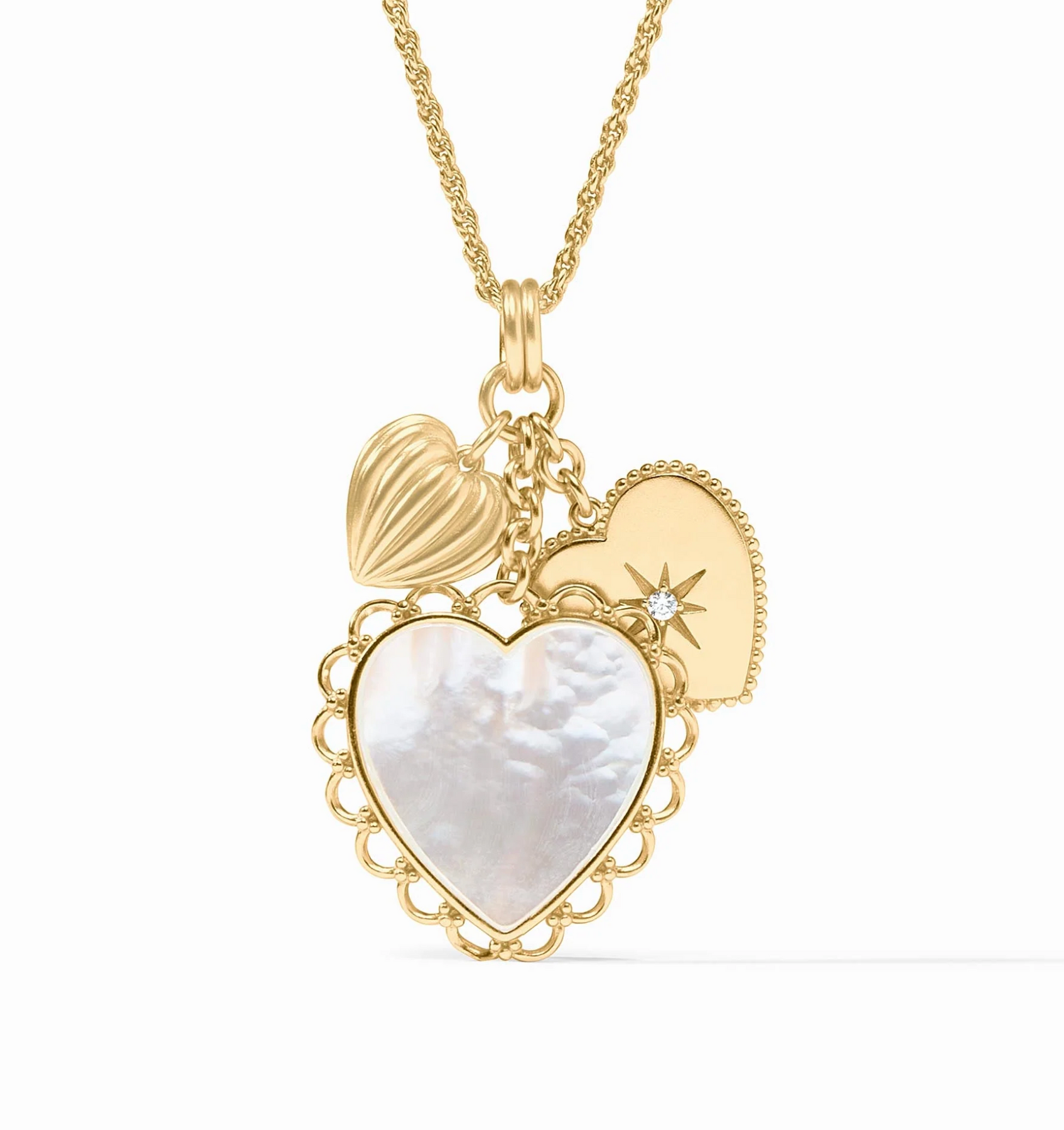 A trio of vintage-inspired golden hearts featuring sparkling gemstones, shimmering mother of pearl, and delicate latticework dance together on a delicate rope chain.