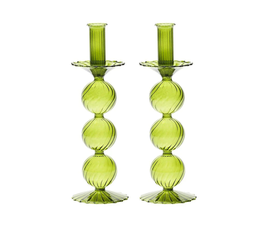 The delicate, hand-blown glass Iris Candlestick features three stacked globes atop a scalloped base. This stunning glass candlestick adds movement and sophistication to any table.
