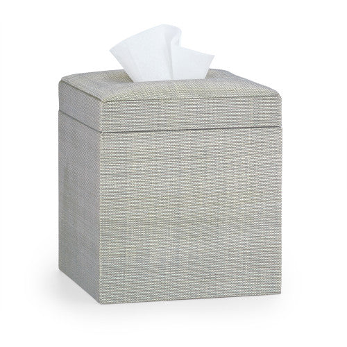 Light and bright in a silvery shade of gray, these tailored bath accessories are produced with natural fibers from the soft, unopened leaves of the Buri palm. The tissue cover is a beautifully constructed box with a hinged lid. Made in the Philippines. Note: the canister, pictured here, is no longer available.