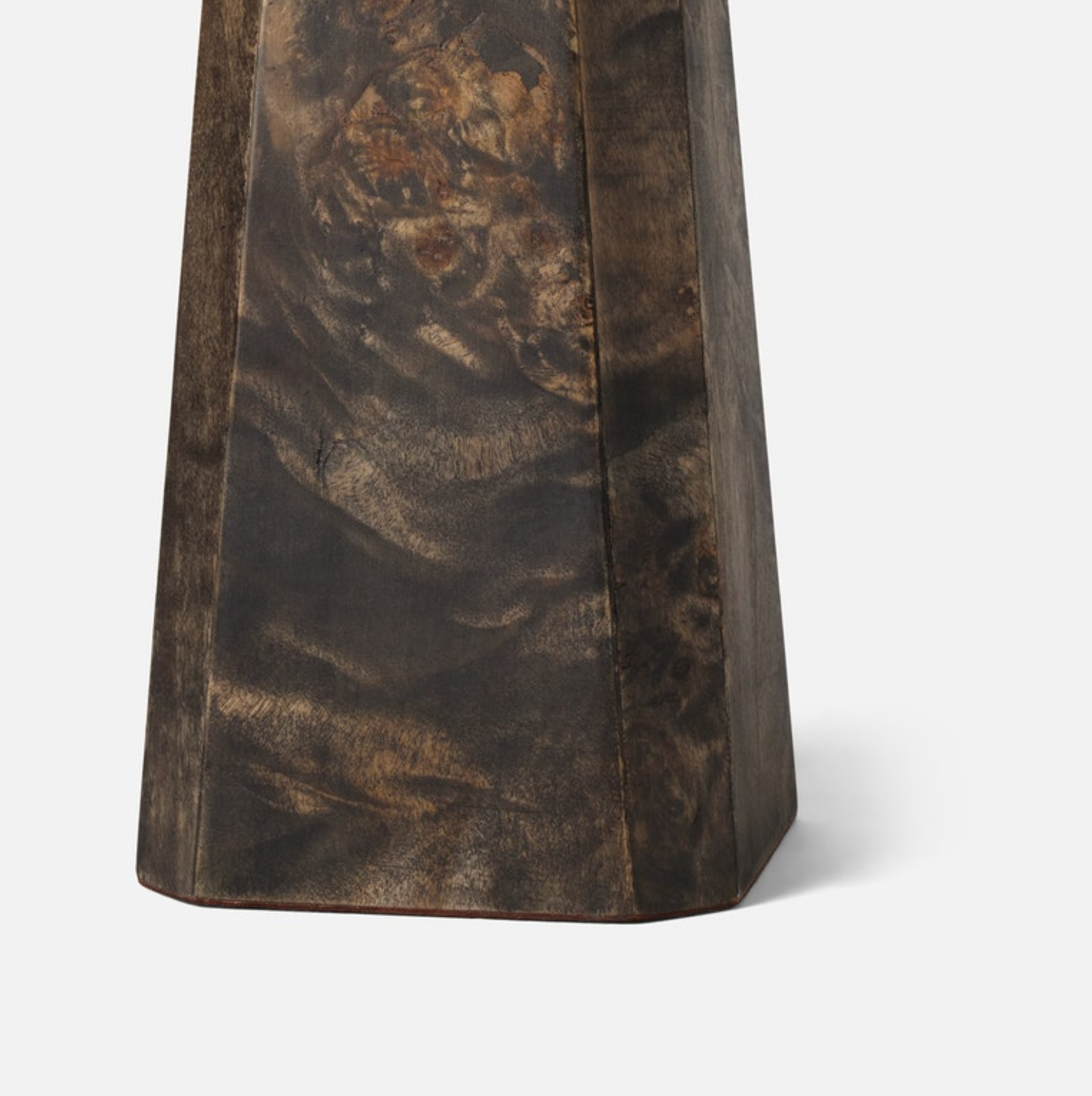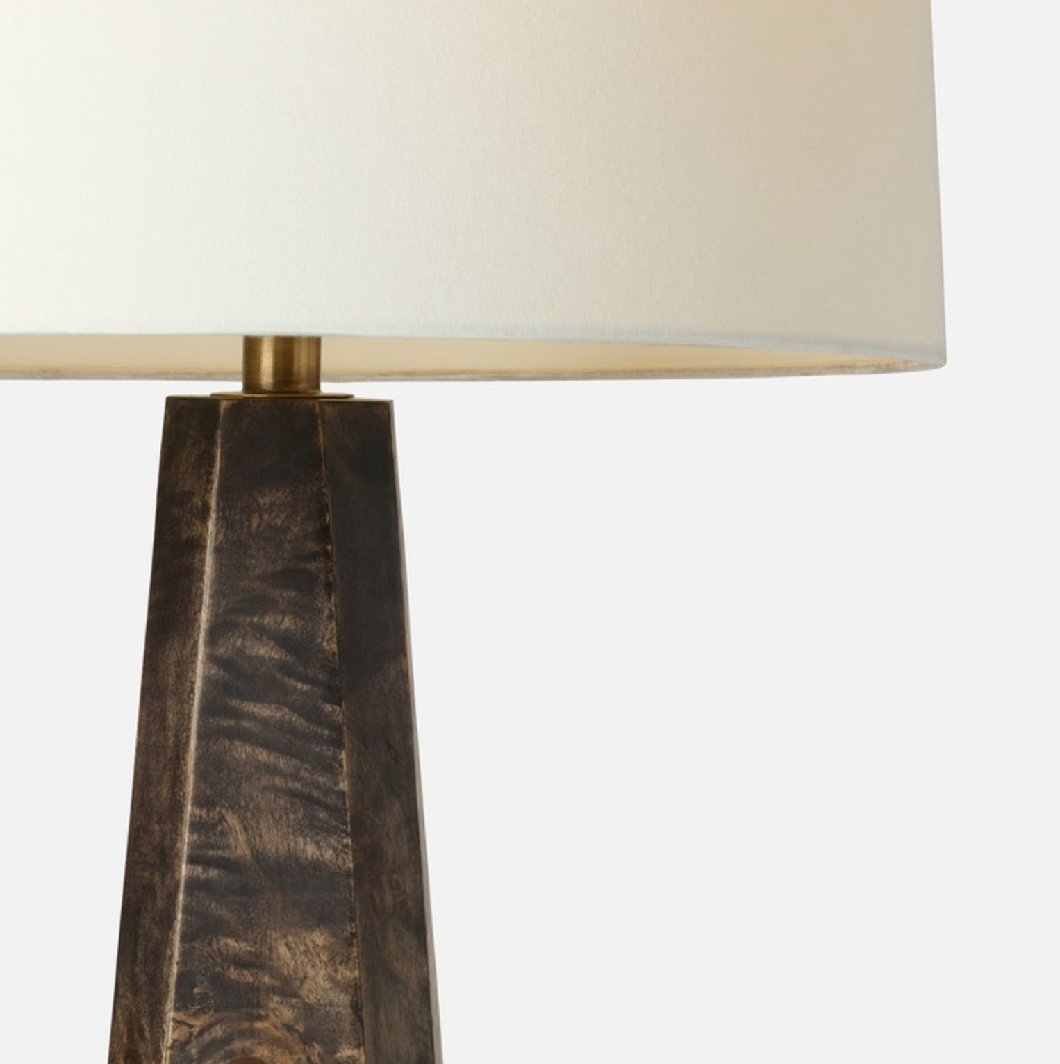 With its prism-like shape, our Tosca table lamp is handcrafted from resilient mappa burl, showcasing natural dark and light pattern variations for a striking, high-contrast look.
