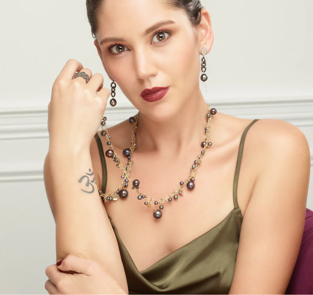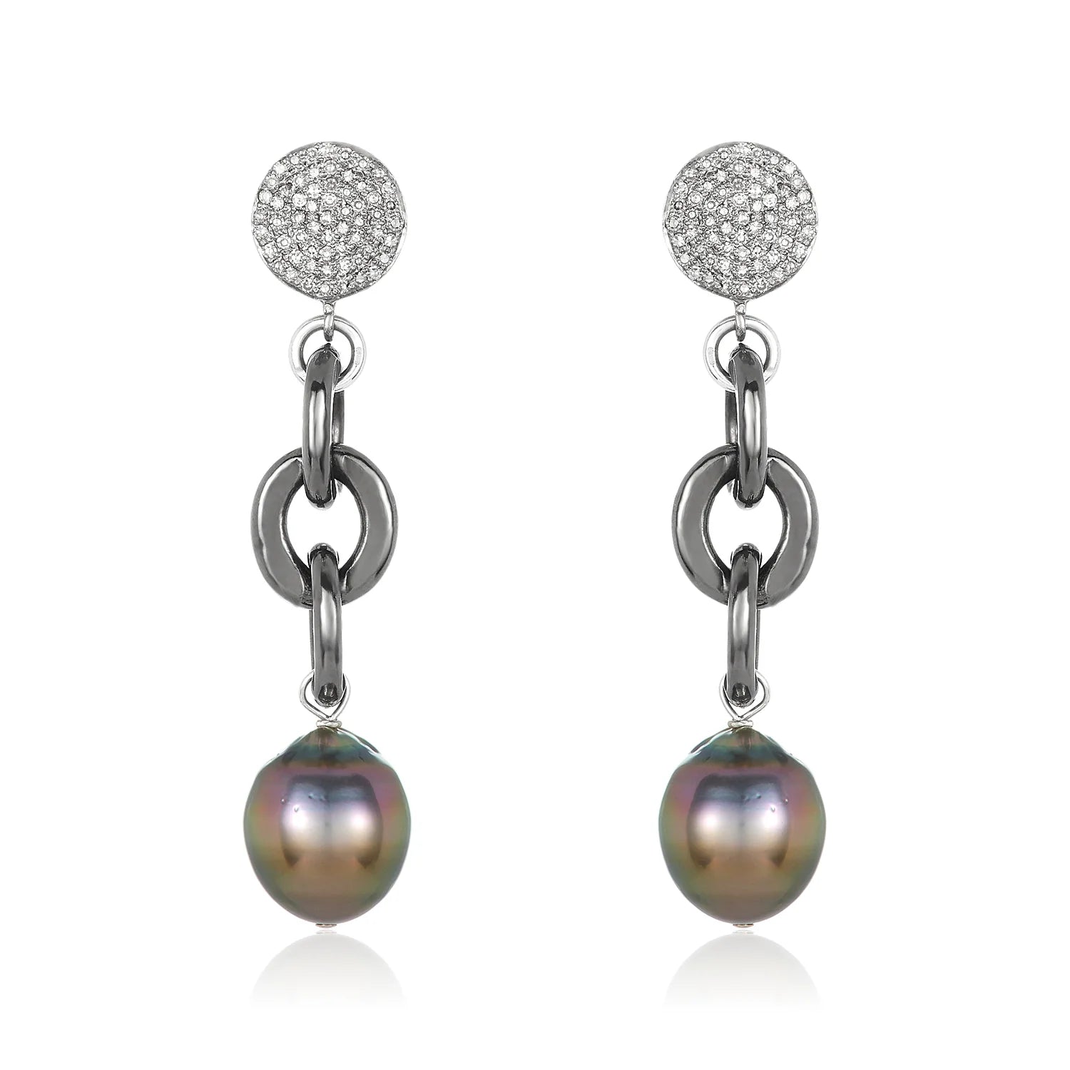 Lush south sea pearls on thick oxidized sterling silver links with shiny pave diamond round posts.