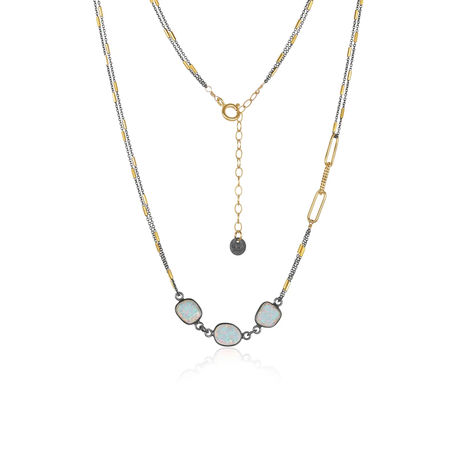 Gilson Japanese Opals with gold-plated tube and oxidized silver double chain with gold-filled paperclips as accents.