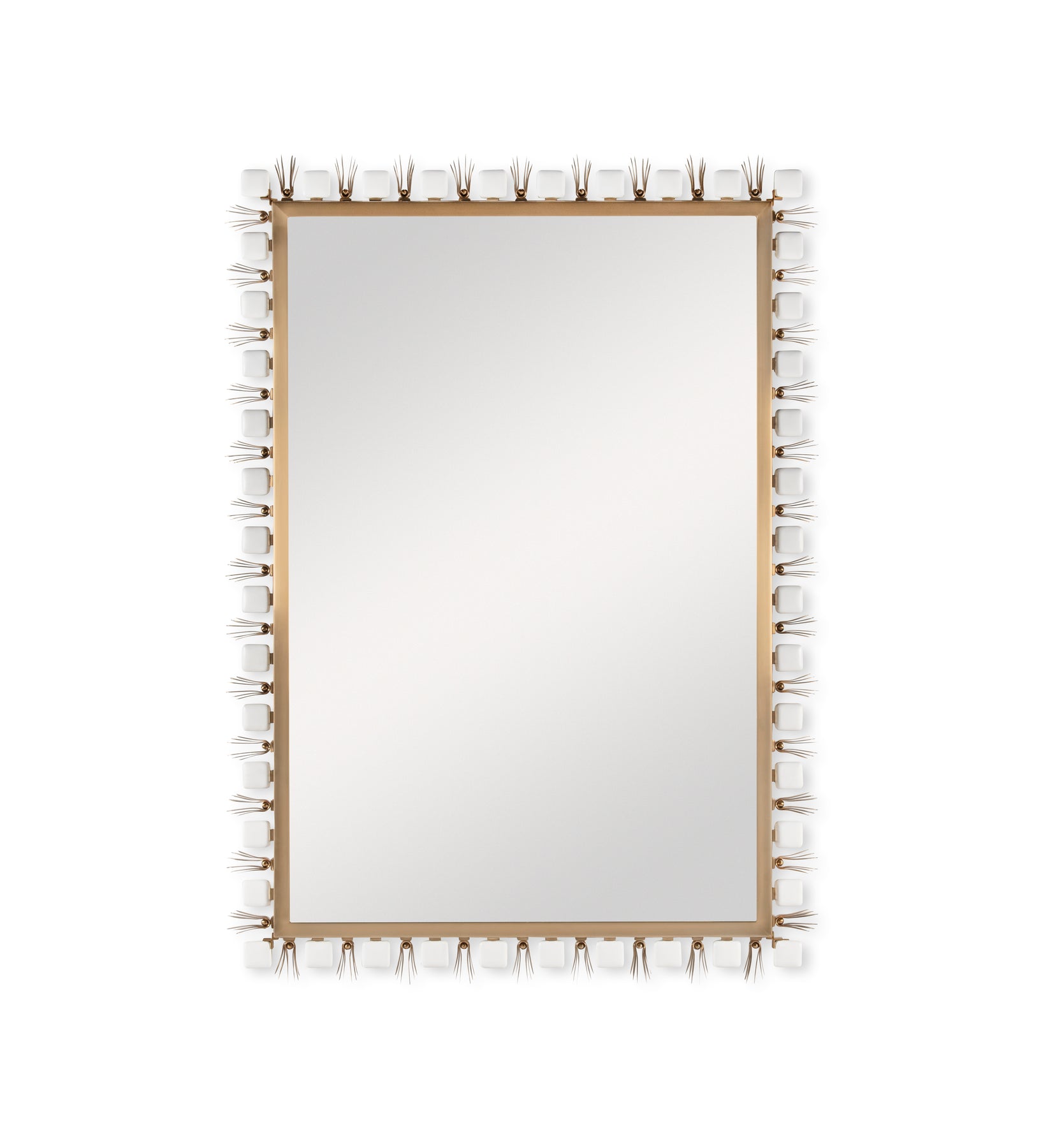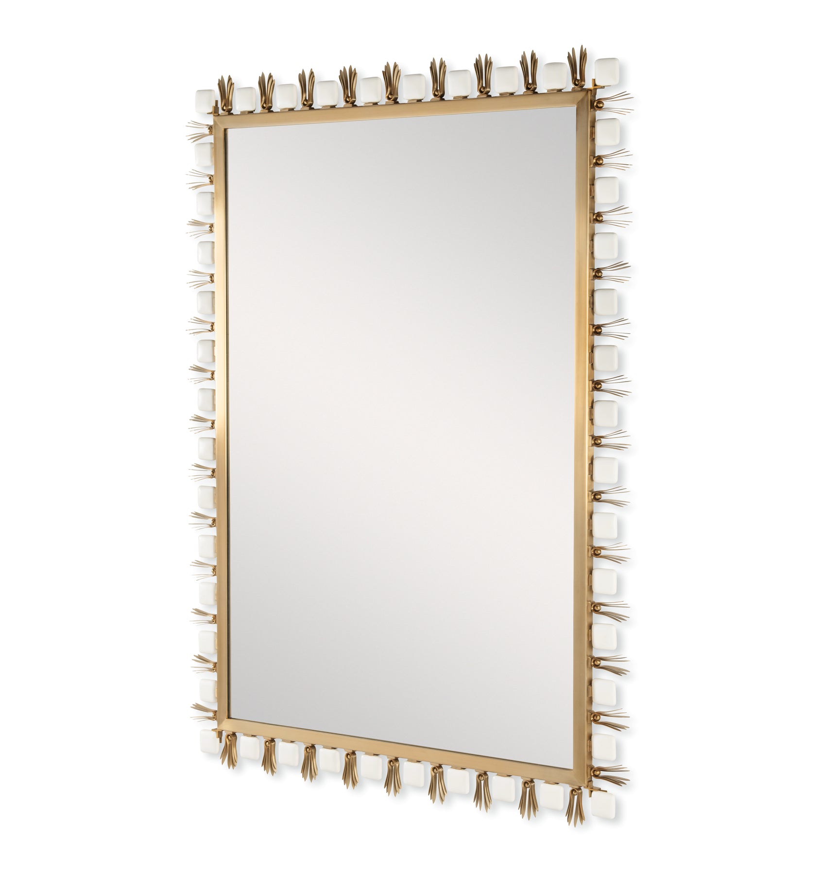 Drawing inspiration from shapes and details found in traditional furniture, the motifs are reinterpreted with a modern sensibility.  A gold leaf finished metal frame around a clear mirror is embellished with  alternating square, white enameled accents and decorative metal flourishes.