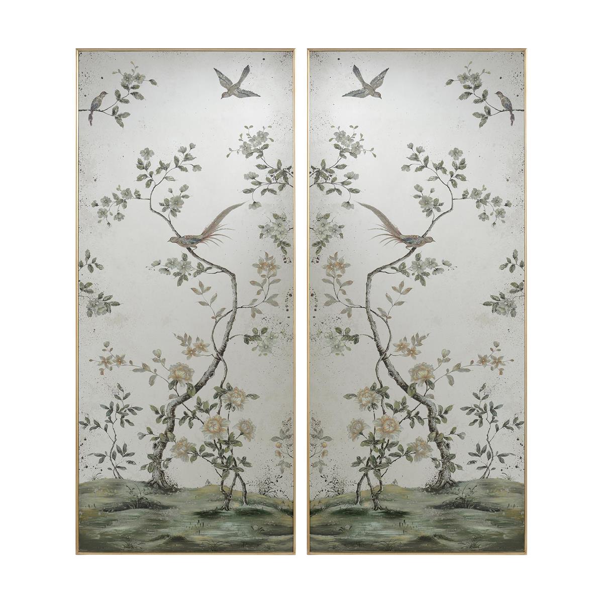 This Mirror Panels depict a gorgeous scene with detailed flora displayed across reverse hand-painted mirrors. A stylish, slender frame in Valyrian Gold provides stunning juxtaposition to the artwork's neutral tones. The panels come equipped with French cleats and are meant to be displayed from a vertical orientation.