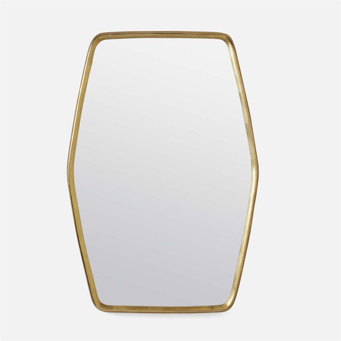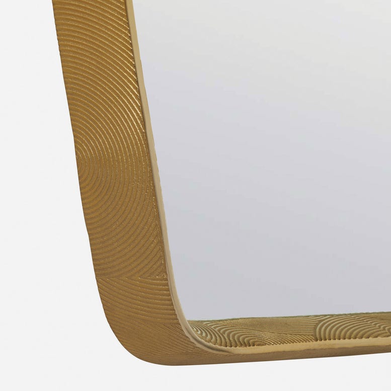 With a rectangular frame amply stretched on its long sides, our Fenris flat mirror pushes one to think outside the box. Concentric circles etched into brushed aluminum and shiny brass add a touch of Hollywood Regency glam. This mirror has a textured frame with an approximate 1.75" depth.