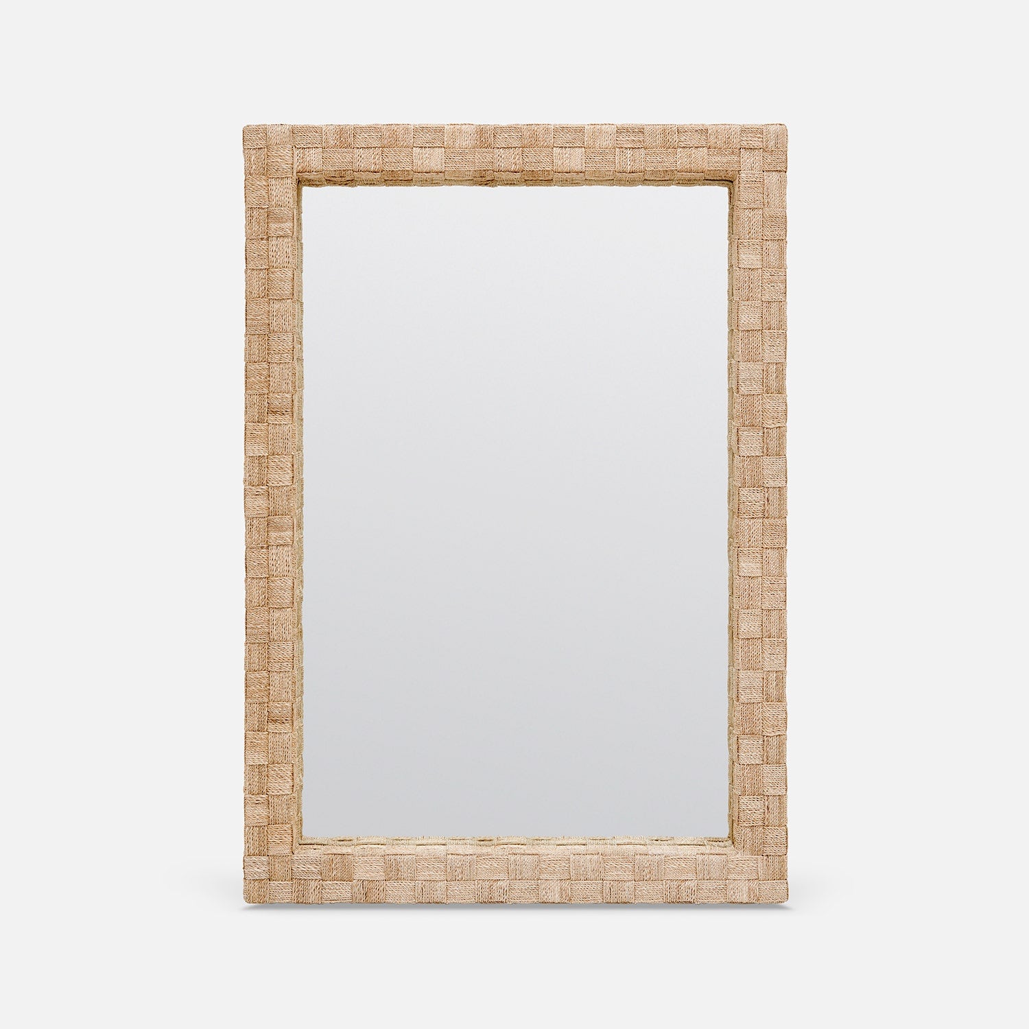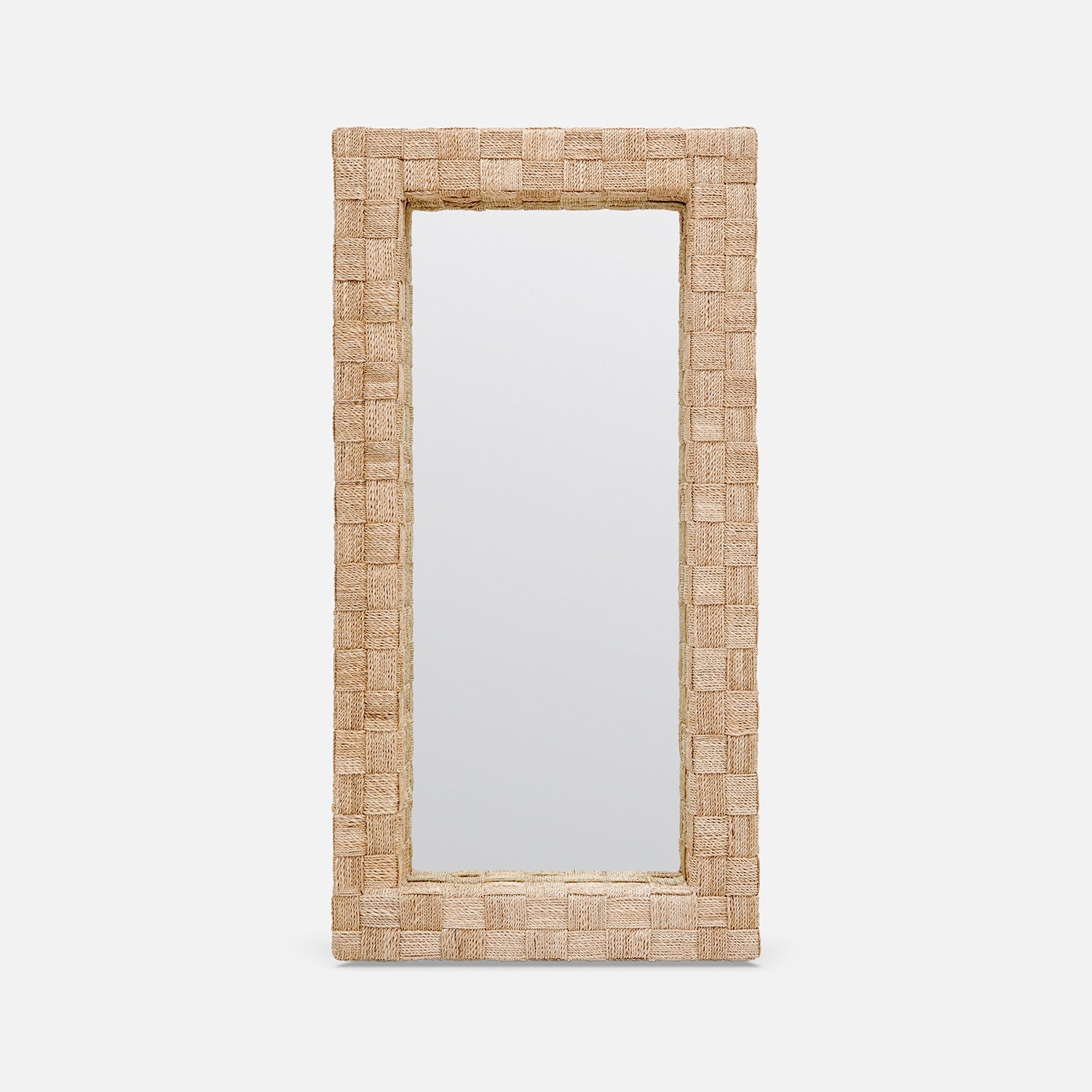 An oversized basket weave pattern is formed into a structured, rectangular mirror. The generous proportions and depth allow the natural abaca fiber and handiwork to shine through. This mirror has a thick, woven frame with a depth of approximately 3" or 4".
